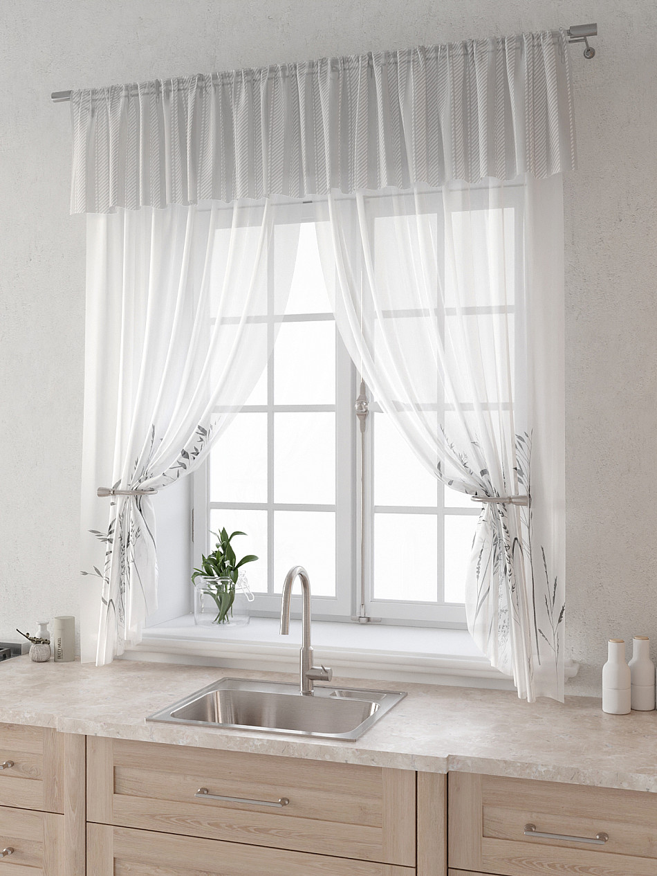 Вуаль 150х160 см. — 2 шт., Ламбрекен 300х40 см. — 1 шт. Комплект штор из вуали оформлены печатным рисунком. Печатный рисунок дает широкие возможности обновить интерьер фактически не требуя ремонта за счет огромного выбора. Ткани с печатным рисунком безопасны и не содержат токсичных веществ. Не смотря на то, что материал легкий, он имеет высокую плотность, мало загрязнятся и не требует особого ухода даже после стирки, что важно для кухонных занавесок. Тюль не выцветает, не растягивается, превосходно драпируются, образуя струящиеся складки. Прекрасное решение для создания красоты и уюта с помощью уникальных дизайнов.