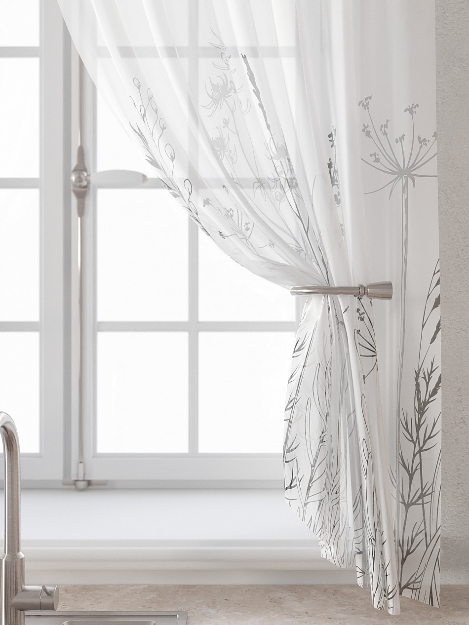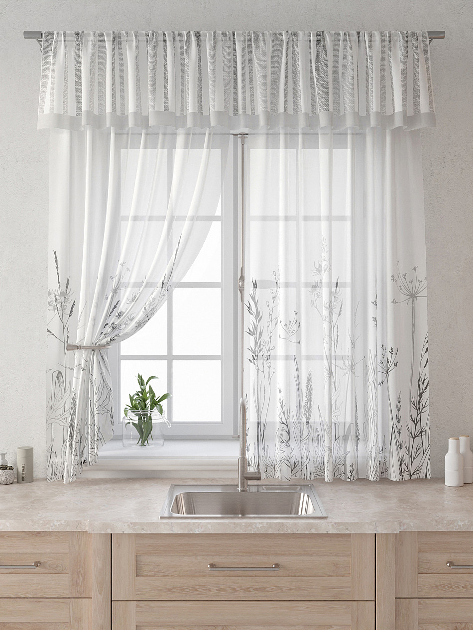 Вуаль 150х180 см. — 2 шт., Ламбрекен 300х40 см. — 1 шт. Комплект штор из вуали оформлены печатным рисунком. Печатный рисунок дает широкие возможности обновить интерьер фактически не требуя ремонта за счет огромного выбора. Ткани с печатным рисунком безопасны и не содержат токсичных веществ. Не смотря на то, что материал легкий, он имеет высокую плотность, мало загрязнятся и не требует особого ухода даже после стирки, что важно для кухонных занавесок. Тюль не выцветает, не растягивается, превосходно драпируются, образуя струящиеся складки. Прекрасное решение для создания красоты и уюта с помощью уникальных дизайнов.