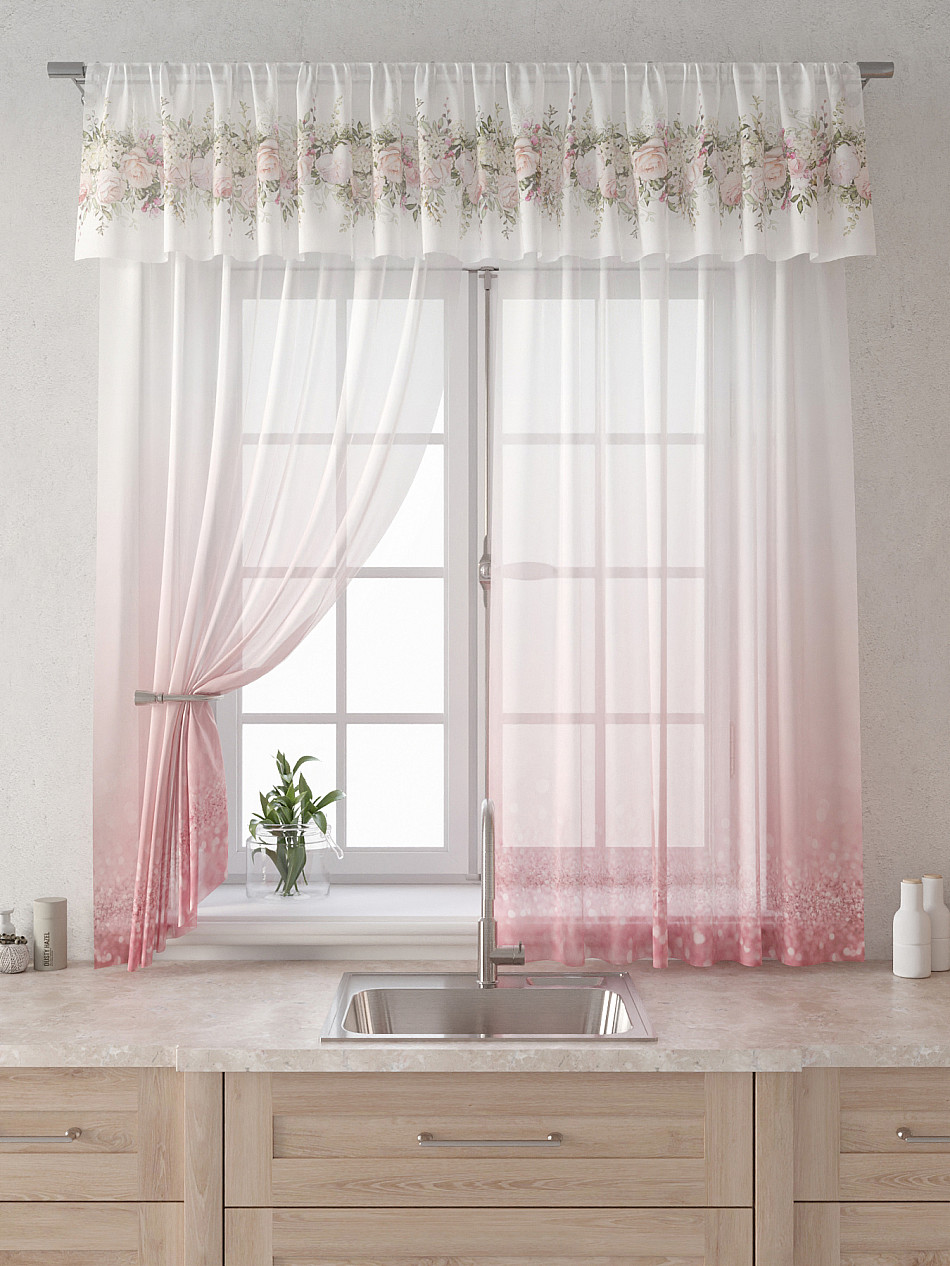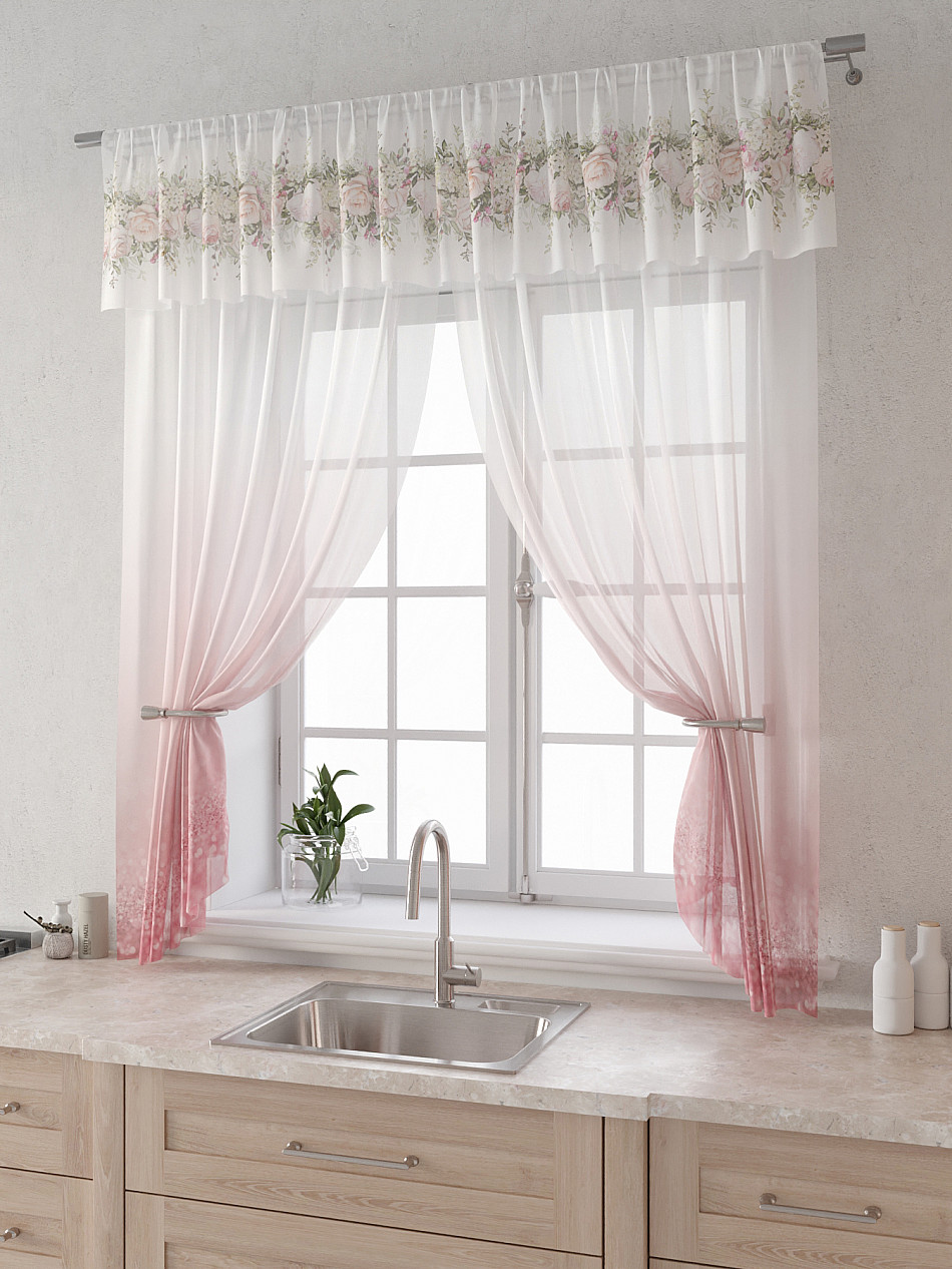 Вуаль 150х160 см. — 2 шт., Ламбрекен 300х40 см. — 1 шт. Комплект штор из вуали оформлены печатным рисунком. Печатный рисунок дает широкие возможности обновить интерьер фактически не требуя ремонта за счет огромного выбора. Ткани с печатным рисунком безопасны и не содержат токсичных веществ. Не смотря на то, что материал легкий, он имеет высокую плотность, мало загрязнятся и не требует особого ухода даже после стирки, что важно для кухонных занавесок. Тюль не выцветает, не растягивается, превосходно драпируются, образуя струящиеся складки. Прекрасное решение для создания красоты и уюта с помощью уникальных дизайнов.