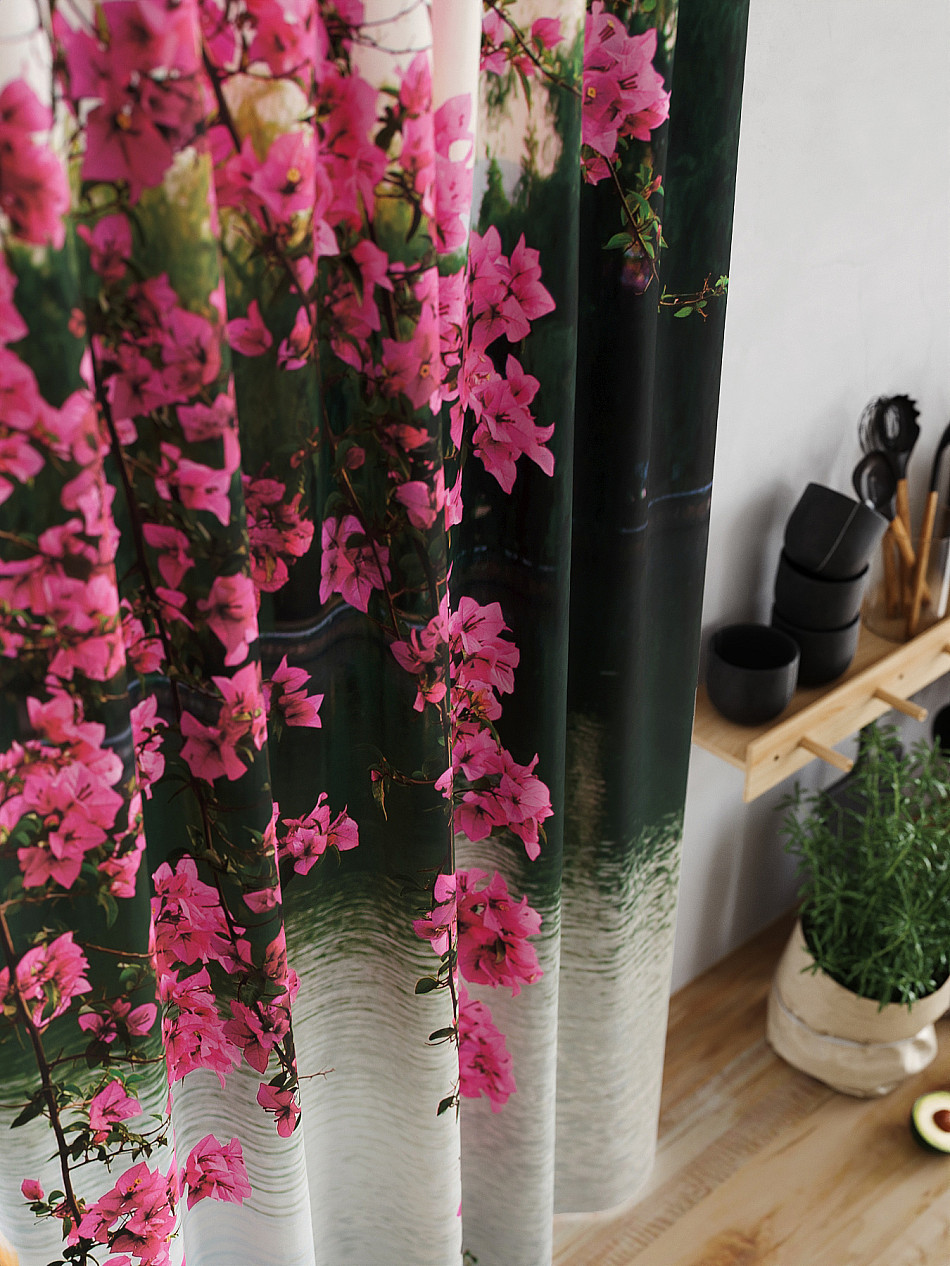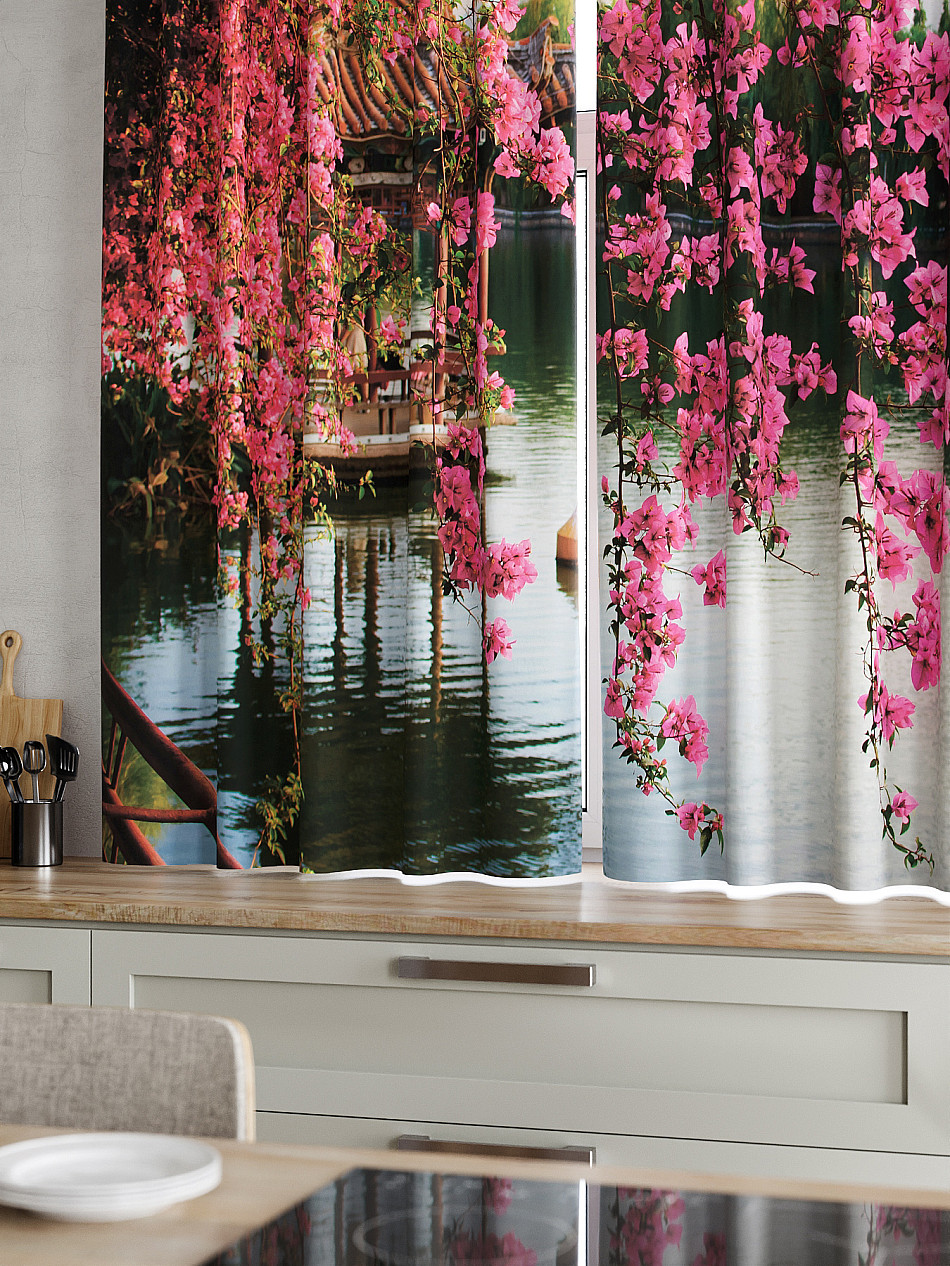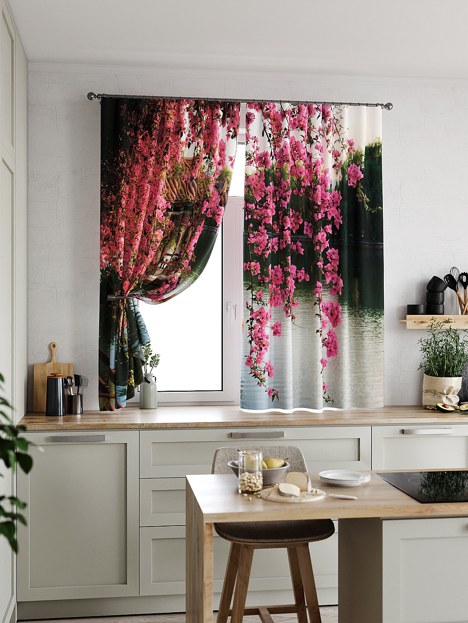 Комплект штор из легкой портьерной ткани (габардин) оформлен печатным рисунком. Печатный рисунок дает широкие возможности обновить интерьер фактически нет требуя ремонта за счет огромного выбора. Ткани с печатным рисунком безопасны и не содержат токсичных веществ. Не смотря на то что, материал легкий, он имеет высокую плотность, мало загрязнятся и не требует особого ухода даже после стирки, что важно для кухонных занавесок. Шторы не выцветают, не растягиваются, превосходно драпируются, образуя струящиеся складки. Прекрасное решение для создания красоты и уюта с помощью уникальных дизайнов.