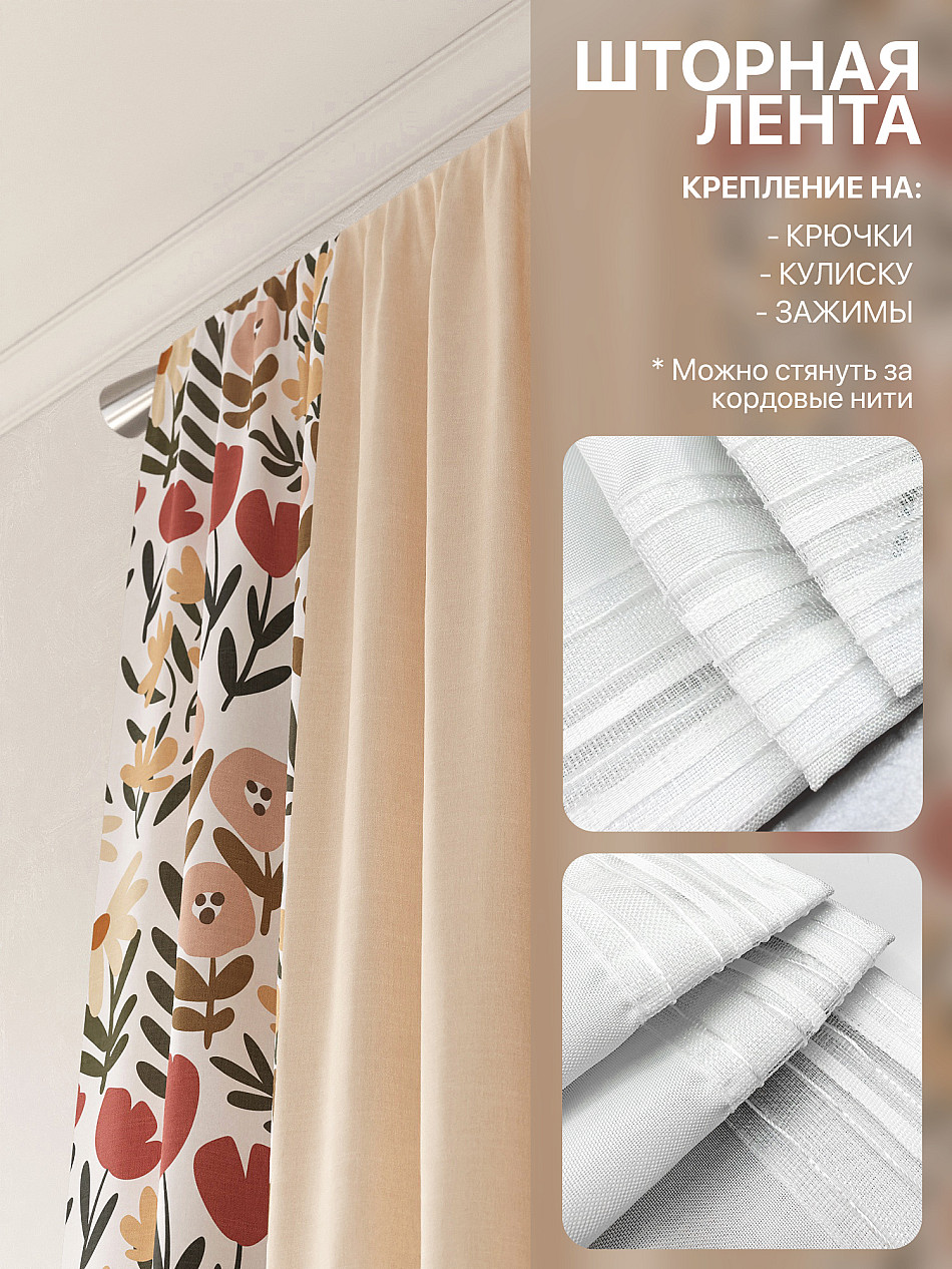 По верхнему краю портьер пришита шторная тесьма 6 см, с ее помощью затянув узелки от кордовых нитей с обеих сторон и стянув их до нужного размера можно сформировать округлые складки, далее вставить крючки в кармашки и повесить на карниз. Обязательно проверьте кордовые нити – они должны быть надежно завязаны, в противном случае во время стягивания они могут вылететь. Шторная тесьма имеет два ряда кармашков, с их помощью можно регулировать не только длину, но и ширину. Такое крепление подходит для всех типов карнизов.