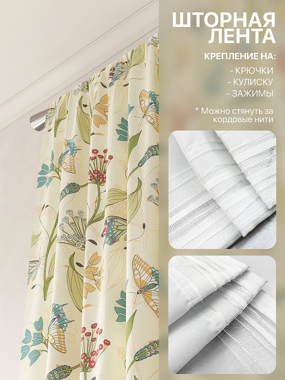 По верхнему краю портьер пришита шторная тесьма 6 см, с ее помощью затянув узелки от кордовых нитей с обеих сторон и стянув их до нужного размера можно сформировать округлые складки, далее вставить крючки в кармашки и повесить на карниз. Обязательно проверьте кордовые нити – они должны быть надежно завязаны, в противном случае во время стягивания они могут вылететь. Шторная тесьма имеет два ряда кармашков, с их помощью можно регулировать не только длину, но и ширину. Такое крепление подходит для всех типов карнизов.