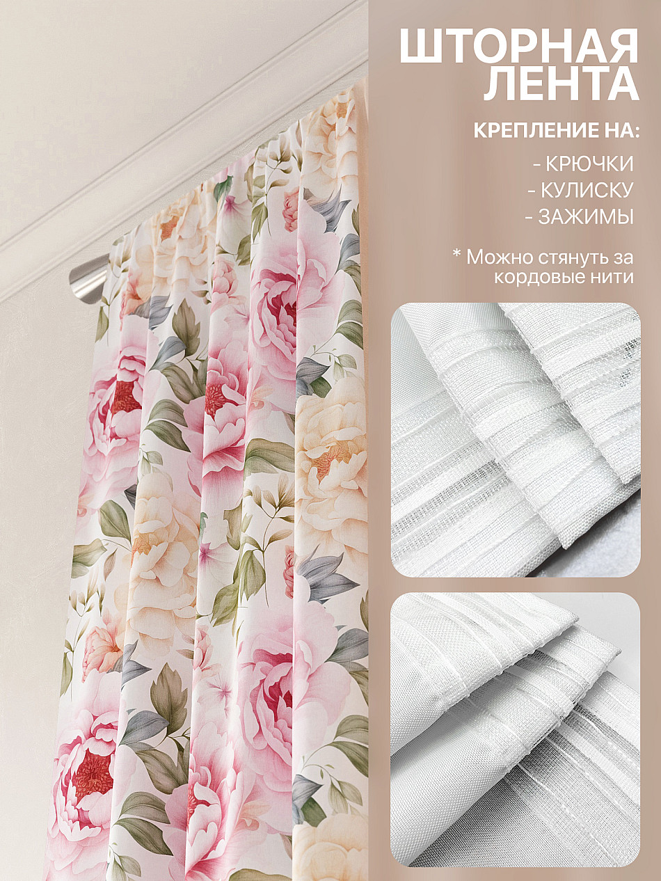 По верхнему краю портьер пришита шторная тесьма 6 см, с ее помощью затянув узелки от кордовых нитей с обеих сторон и стянув их до нужного размера можно сформировать округлые складки, далее вставить крючки в кармашки и повесить на карниз. Обязательно проверьте кордовые нити – они должны быть надежно завязаны, в противном случае во время стягивания они могут вылететь. Шторная тесьма имеет два ряда кармашков, с их помощью можно регулировать не только длину, но и ширину. Такое крепление подходит для всех типов карнизов.