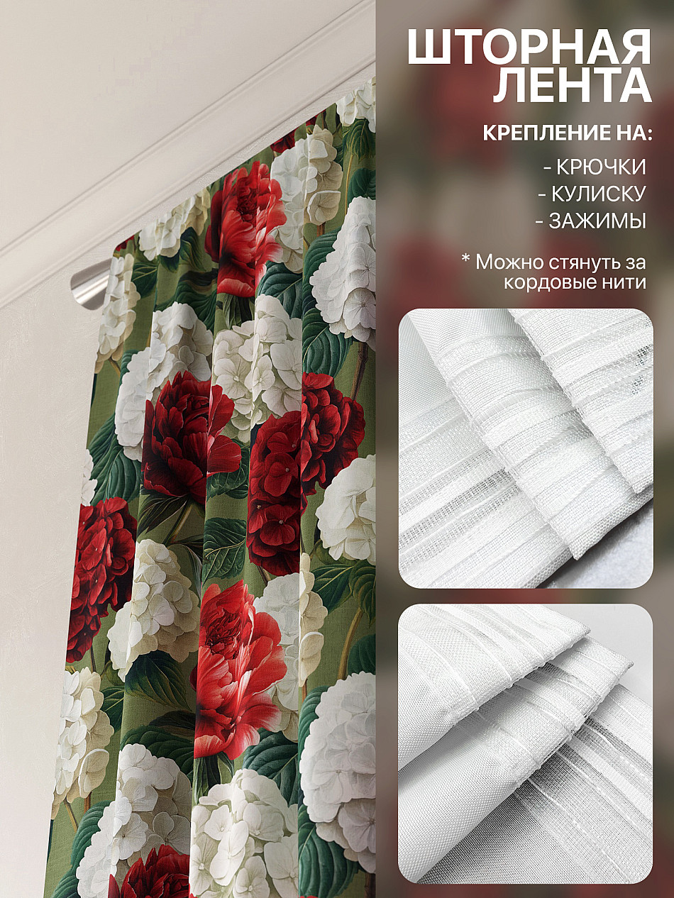По верхнему краю портьер пришита шторная тесьма 6 см, с ее помощью затянув узелки от кордовых нитей с обеих сторон и стянув их до нужного размера можно сформировать округлые складки, далее вставить крючки в кармашки и повесить на карниз. Обязательно проверьте кордовые нити – они должны быть надежно завязаны, в противном случае во время стягивания они могут вылететь. Шторная тесьма имеет два ряда кармашков, с их помощью можно регулировать не только длину, но и ширину. Такое крепление подходит для всех типов карнизов.