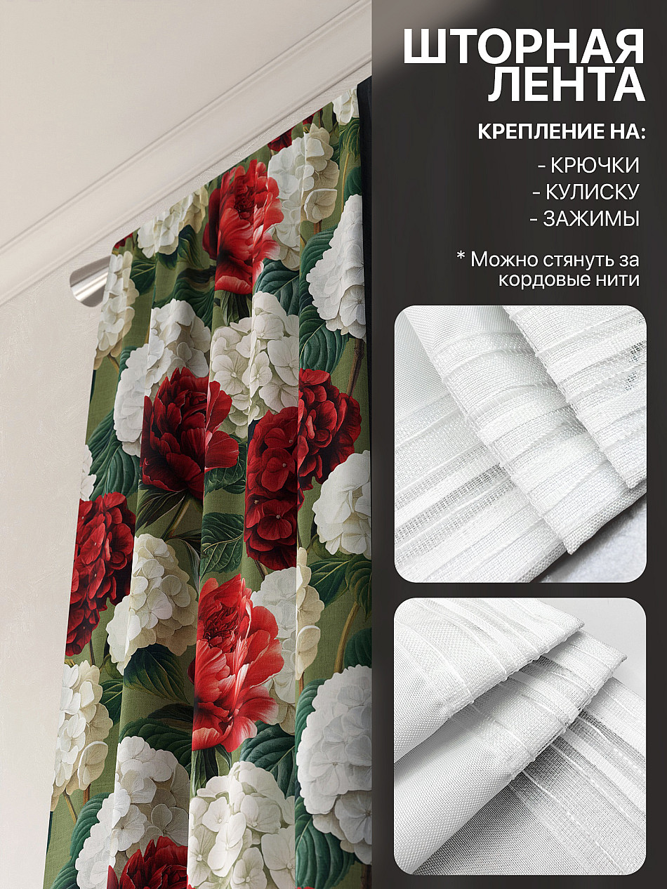 По верхнему краю портьер пришита шторная тесьма 6 см, с ее помощью затянув узелки от кордовых нитей с обеих сторон и стянув их до нужного размера можно сформировать округлые складки, далее вставить крючки в кармашки и повесить на карниз. Обязательно проверьте кордовые нити – они должны быть надежно завязаны, в противном случае во время стягивания они могут вылететь. Шторная тесьма имеет два ряда кармашков, с их помощью можно регулировать не только длину, но и ширину. Такое крепление подходит для всех типов карнизов.
