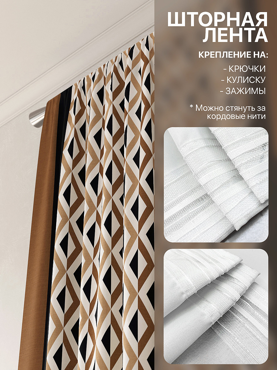 По верхнему краю портьер пришита шторная тесьма 6 см, с ее помощью затянув узелки от кордовых нитей с обеих сторон и стянув их до нужного размера можно сформировать округлые складки, далее вставить крючки в кармашки и повесить на карниз. Обязательно проверьте кордовые нити – они должны быть надежно завязаны, в противном случае во время стягивания они могут вылететь. Шторная тесьма имеет два ряда кармашков, с их помощью можно регулировать не только длину, но и ширину. Такое крепление подходит для всех типов карнизов.