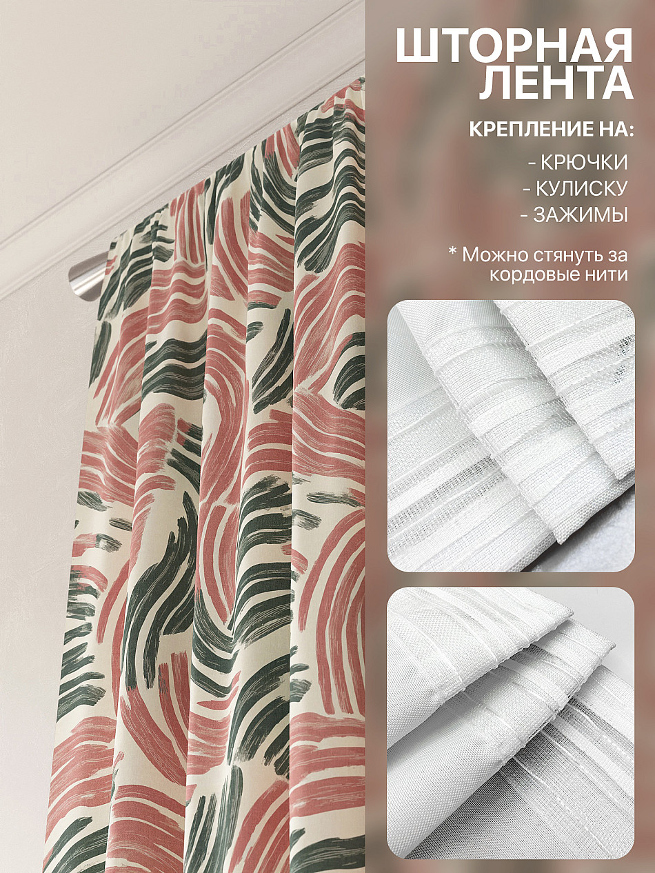 По верхнему краю портьер пришита шторная тесьма 6 см, с ее помощью затянув узелки от кордовых нитей с обеих сторон и стянув их до нужного размера можно сформировать округлые складки, далее вставить крючки в кармашки и повесить на карниз. Обязательно проверьте кордовые нити – они должны быть надежно завязаны, в противном случае во время стягивания они могут вылететь. Шторная тесьма имеет два ряда кармашков, с их помощью можно регулировать не только длину, но и ширину. Такое крепление подходит для всех типов карнизов.