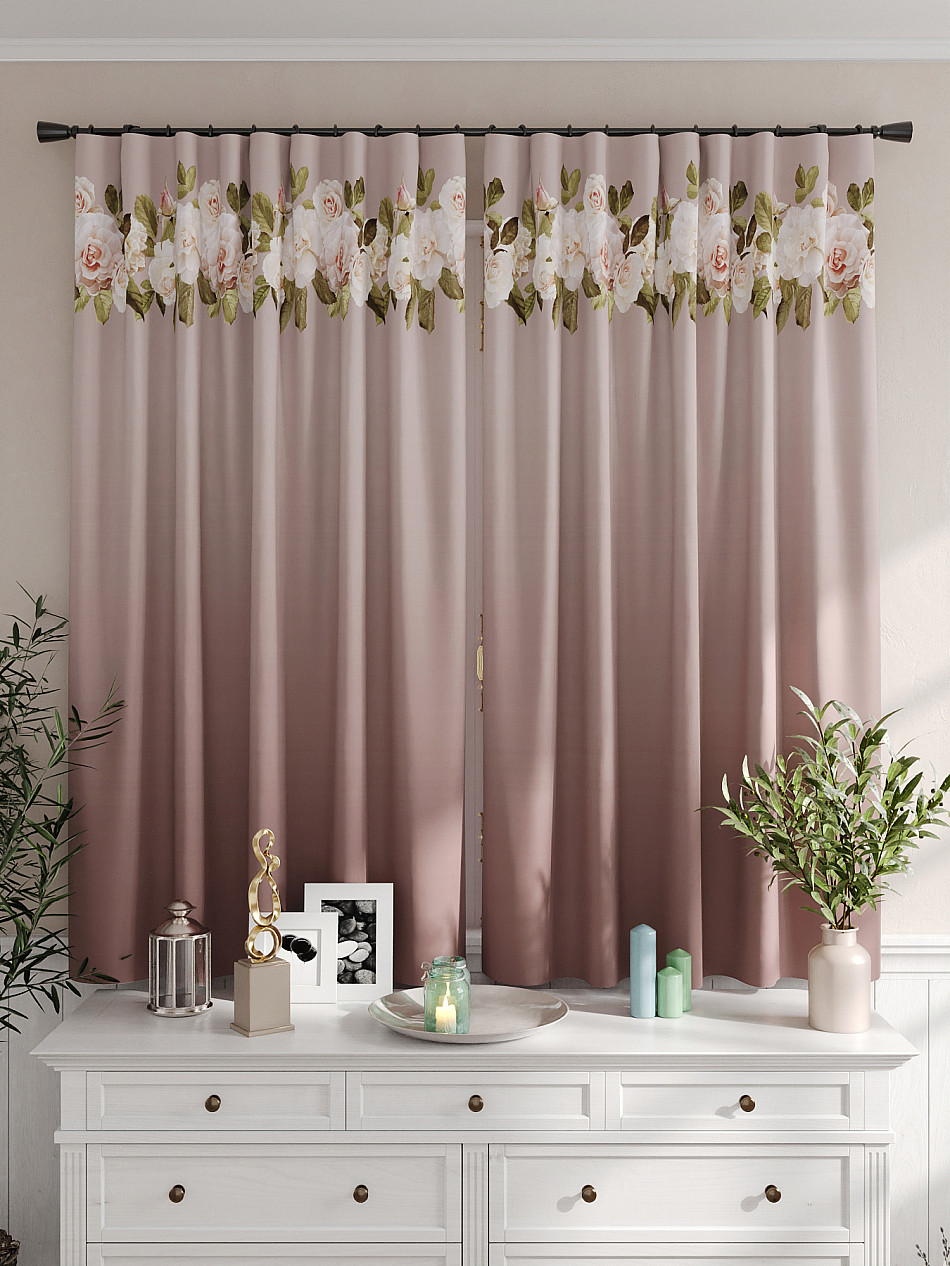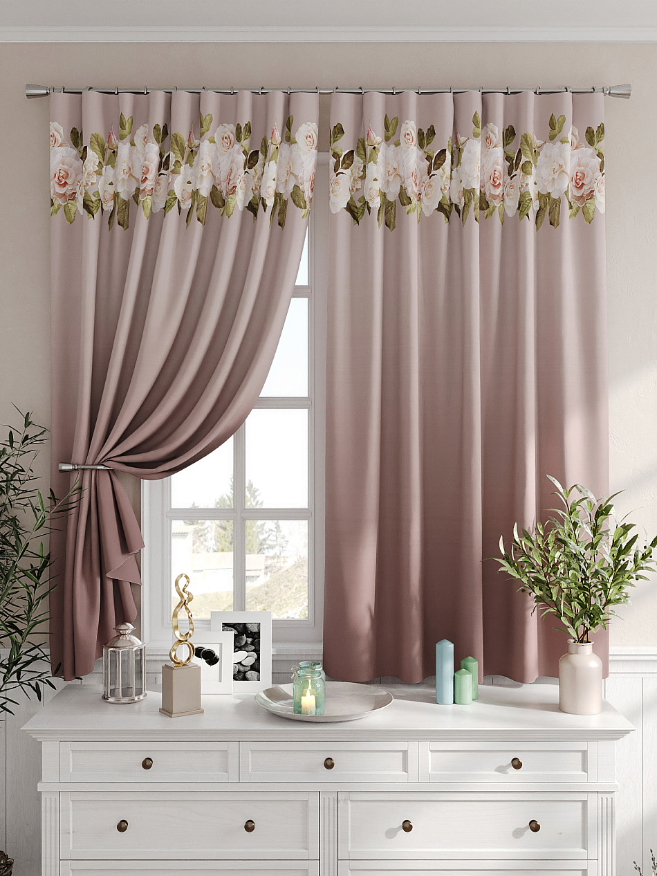 Портьеры 2 шт. Комплект штор из легкой портьерной ткани (габардин) оформлен печатным рисунком. Печатный рисунок дает широкие возможности обновить интерьер фактически не требуя ремонта за счет огромного выбора. Ткани с печатным рисунком безопасны и не содержат токсичных веществ. Не смотря на то, что материал легкий, он имеет высокую плотность, мало загрязнятся и не требует особого ухода даже после стирки, что важно для кухонных занавесок. Шторы не выцветают, не растягиваются, превосходно драпируются, образуя струящиеся складки. Прекрасное решение для создания красоты и уюта с помощью уникальных дизайнов.