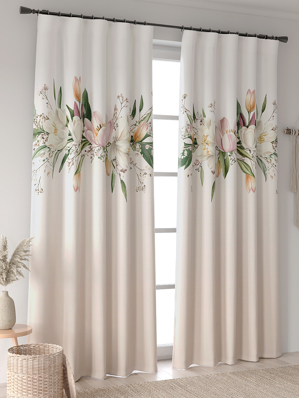 По верхнему краю портьеры пришита шторная тесьма 6 см, с ее помощью затянув узелки от кордовых нитей с обеих сторон и стянув их до нужного размера можно сформировать округлые складки, далее вставить крючки в кармашки и повесить на карниз. Обязательно проверьте кордовые нити – они должны быть надежно завязаны, в противном случае во время стягивания они могут вылететь. Шторная тесьма имеет два ряда кармашков, с их помощью можно регулировать не только длину, но и ширину. Такое крепление подходит для всех типов карнизов.