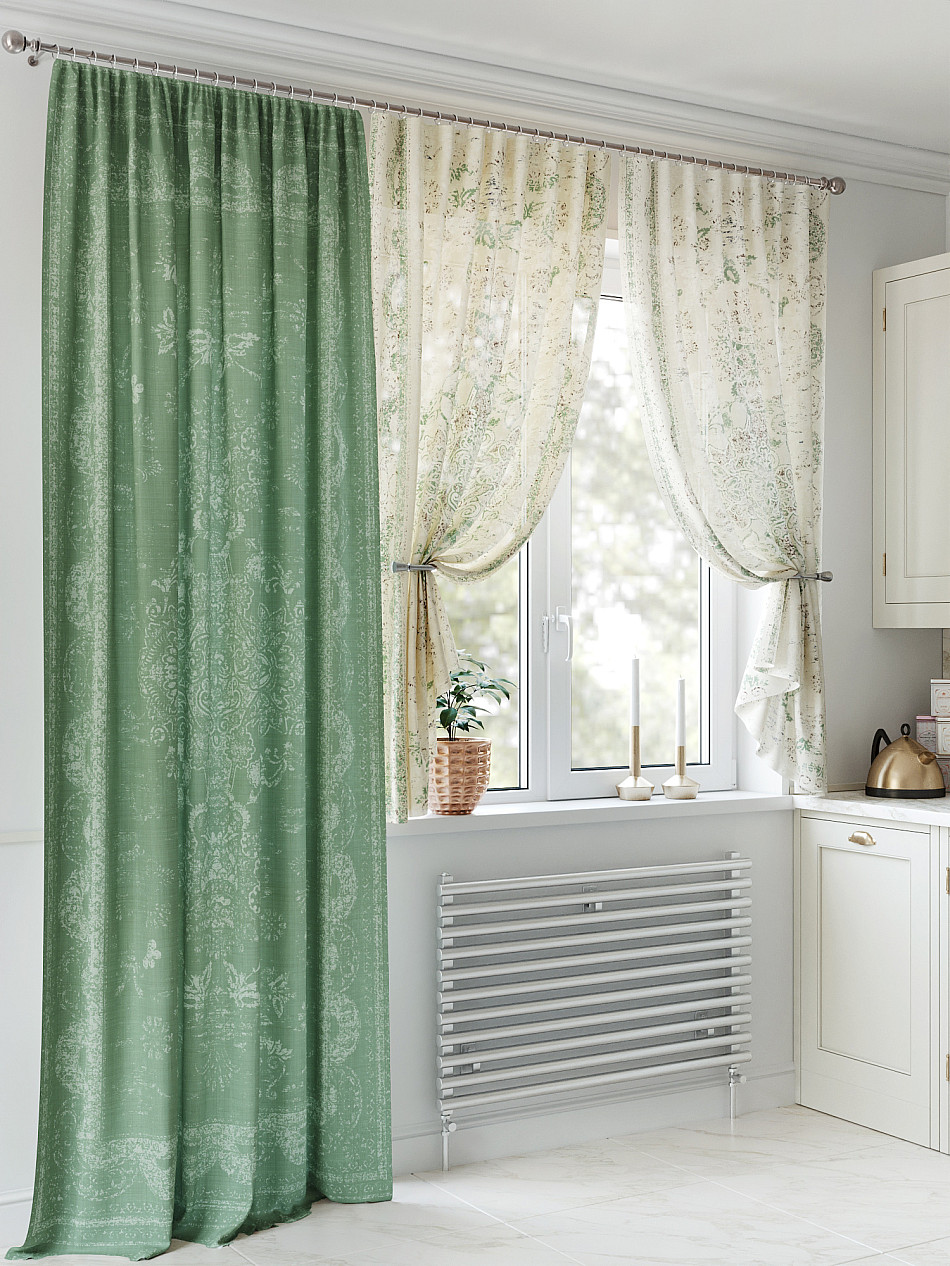 Портьера 150х250 см — 1 шт., вуаль 150х180 см — 2 шт. ( Уменьшить высоту ) Крепление: шторная лента (крючки), кулиска Подробнее