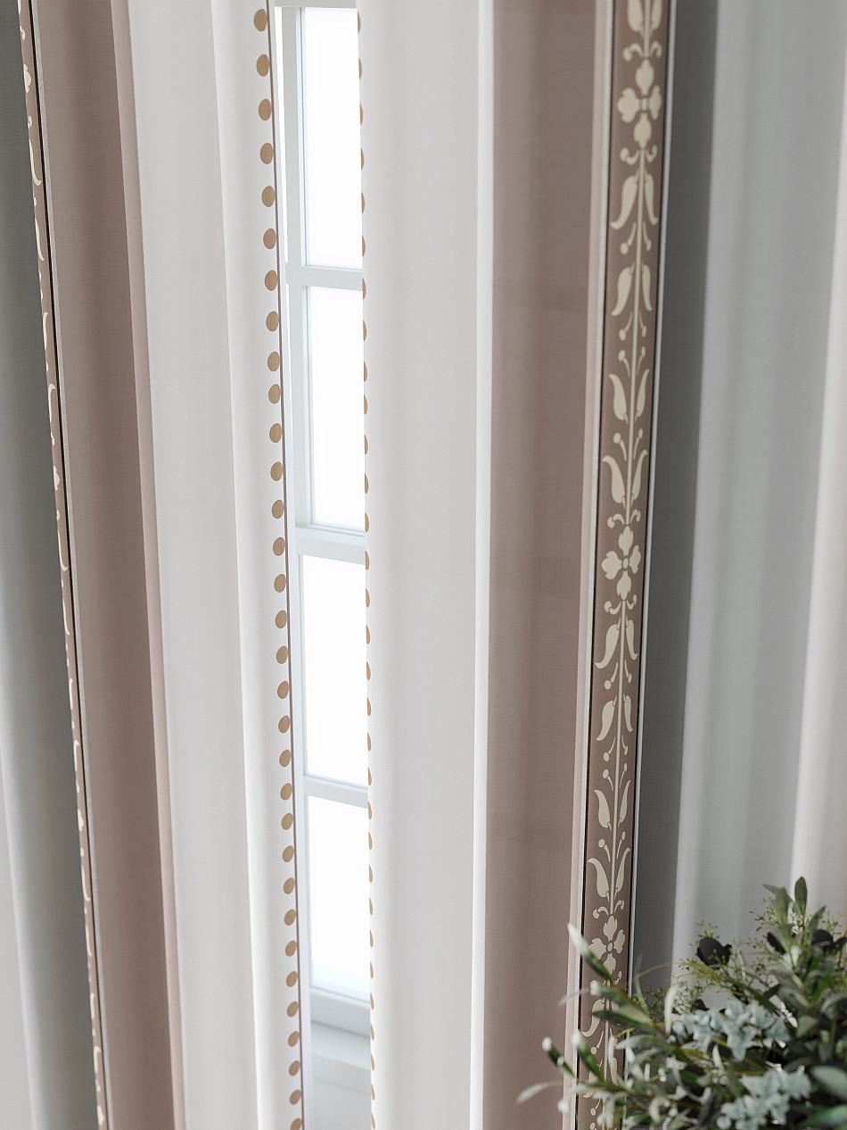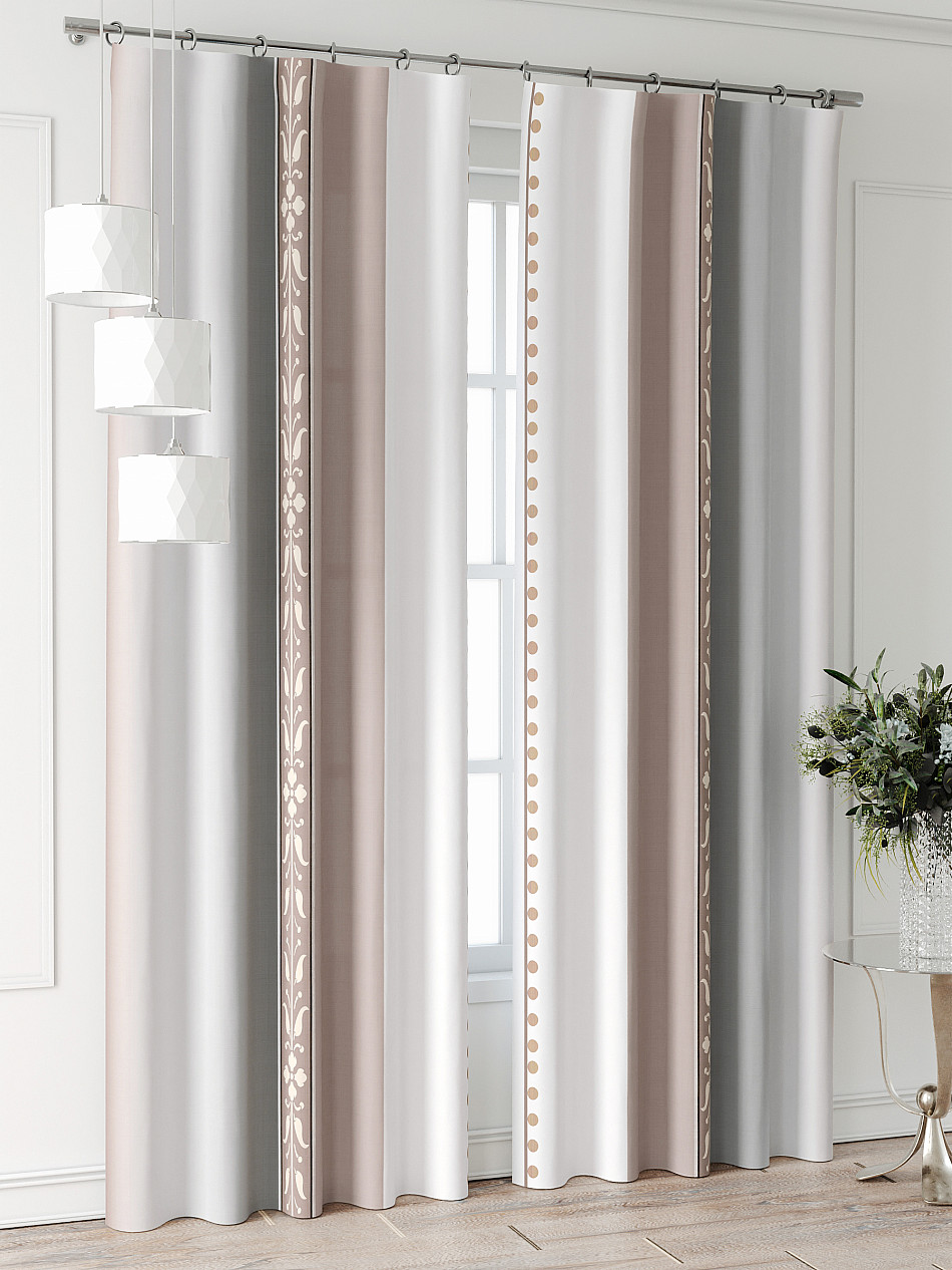 По верхнему краю портьер пришита шторная тесьма 6 см, с ее помощью затянув узелки от кордовых нитей с обеих сторон и стянув их до нужного размера можно сформировать округлые складки, далее вставить крючки в кармашки и повесить на карниз. Обязательно проверьте кордовые нити – они должны быть надежно завязаны, в противном случае во время стягивания они могут вылететь. Шторная тесьма имеет два ряда кармашков, с их помощью можно регулировать не только длину, но и ширину. Такое крепление подходит для всех типов карнизов.