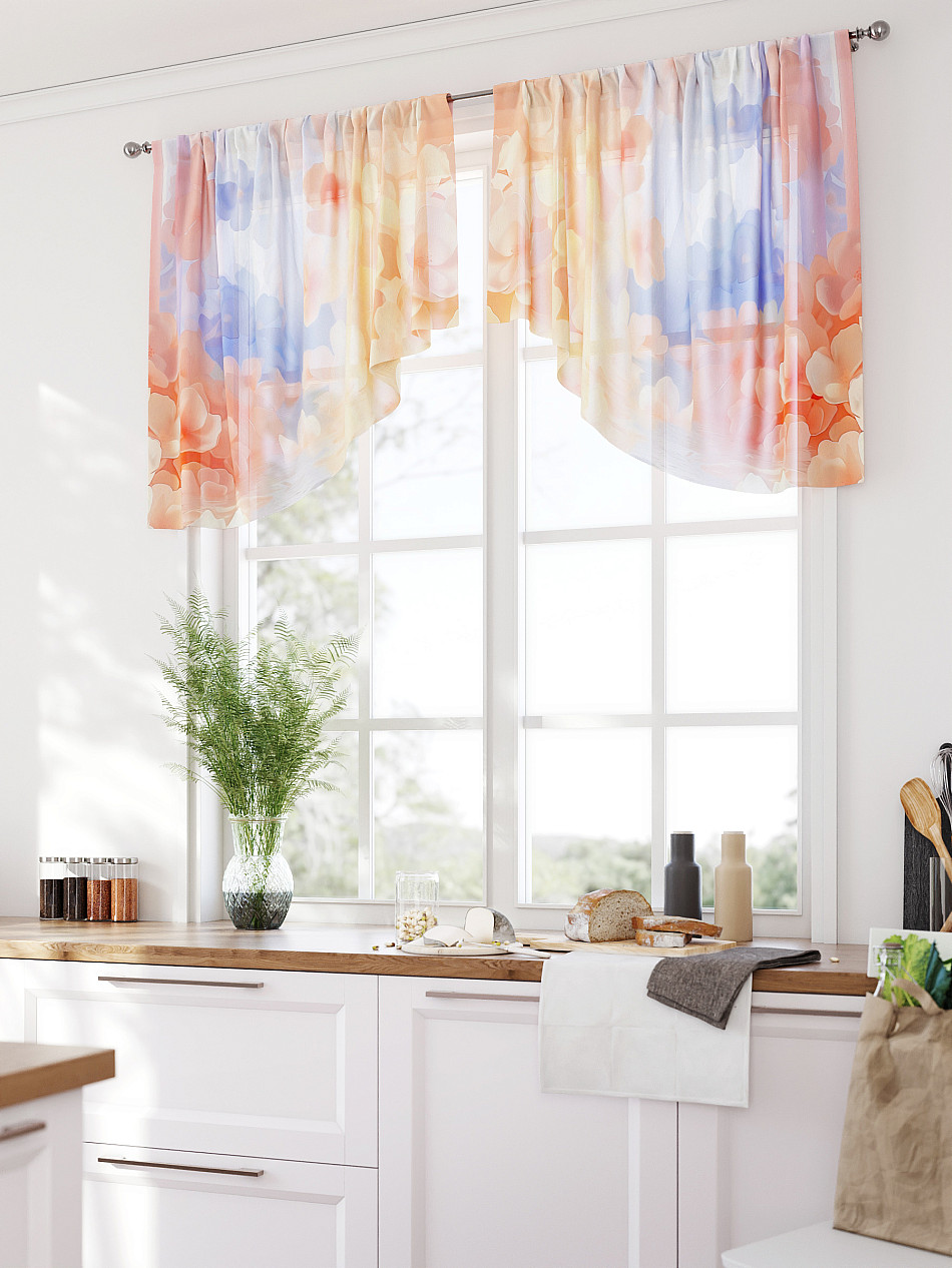 Комплект штор из легкой вуали оформлен печатным рисунком. Печатный рисунок дает широкие возможности обновить интерьер фактически нет требуя ремонта за счет огромного выбора. Ткани с печатным рисунком безопасны и не содержат токсичных веществ. Не смотря на то что, материал легкий, он имеет высокую плотность, мало загрязнятся и не требует особого ухода даже после стирки, что важно для кухонных занавесок. Шторы не выцветают, не растягиваются, превосходно драпируются, образуя струящиеся складки. Прекрасное решение для создания красоты и уюта с помощью уникальных дизайнов.