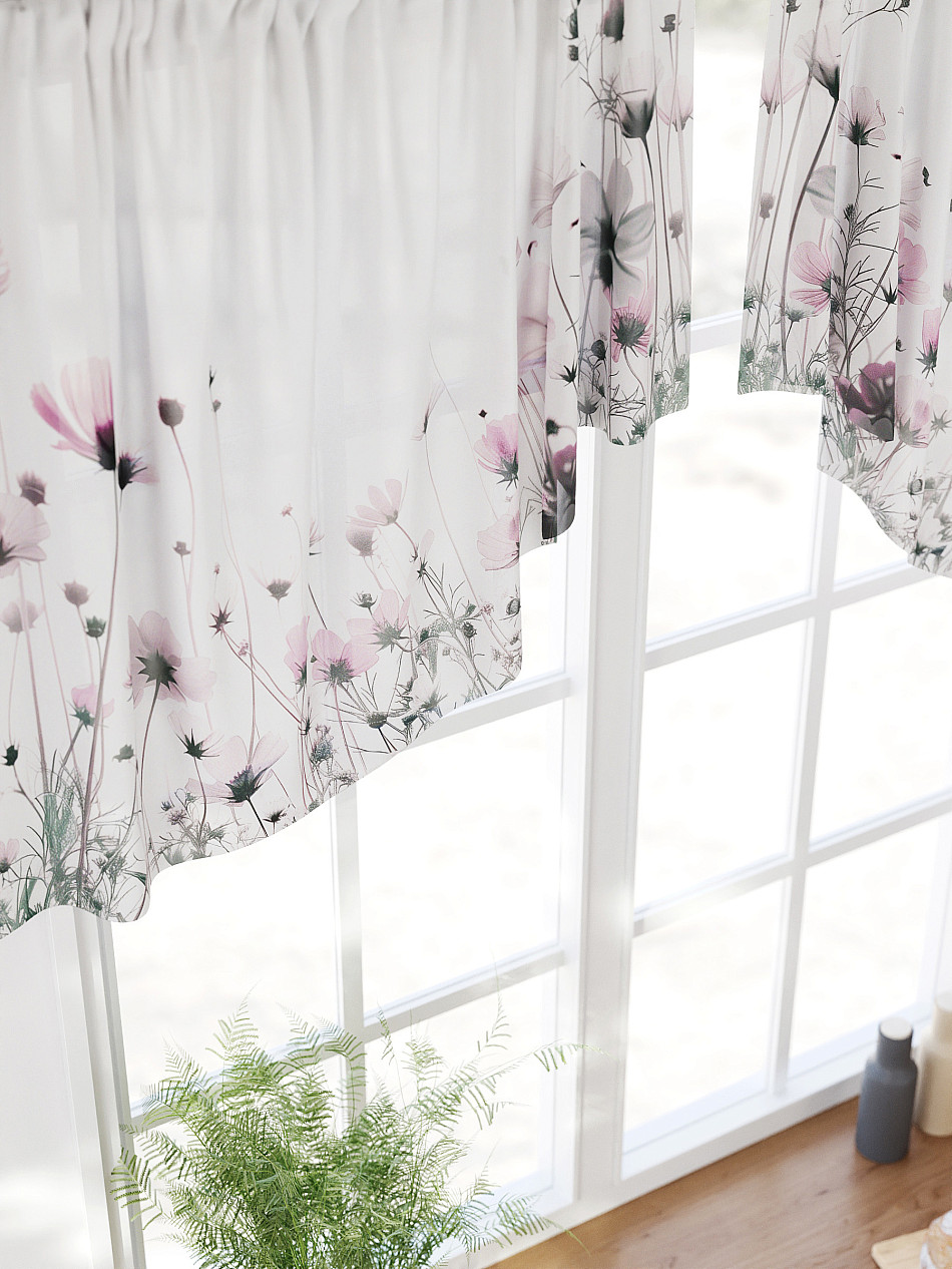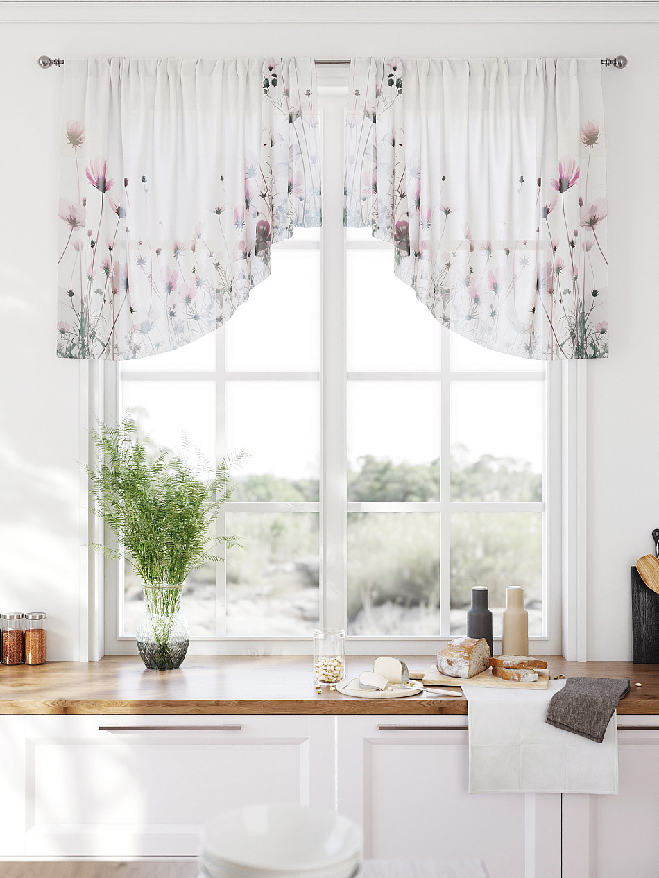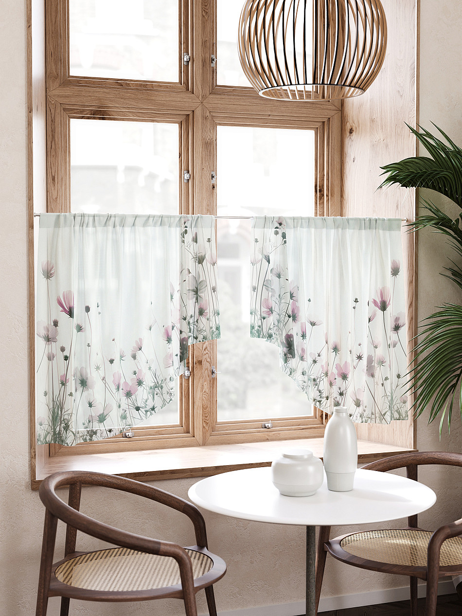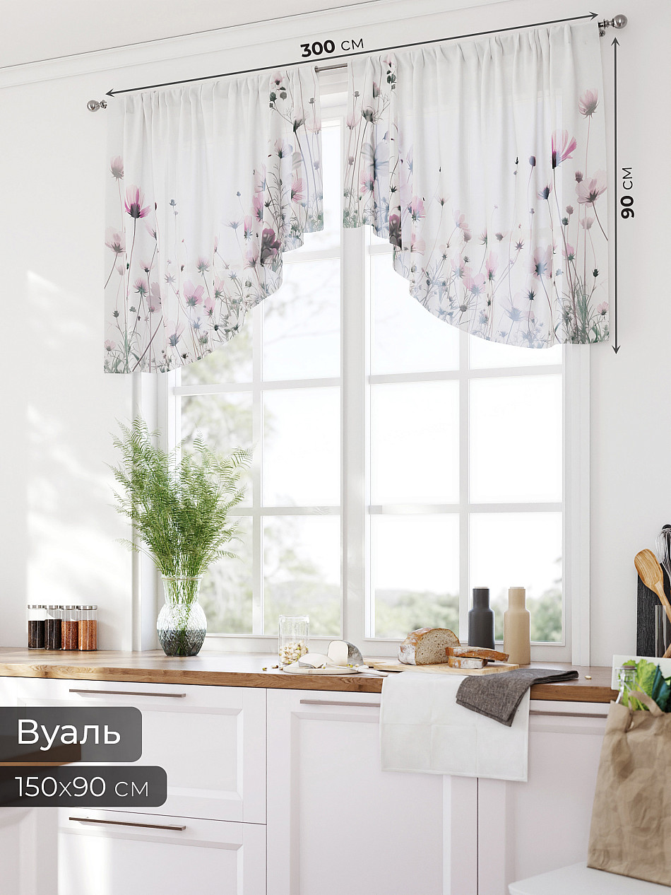 Комплект штор из легкой вуали оформлен печатным рисунком. Печатный рисунок дает широкие возможности обновить интерьер фактически нет требуя ремонта за счет огромного выбора. Ткани с печатным рисунком безопасны и не содержат токсичных веществ. Не смотря на то что, материал легкий, он имеет высокую плотность, мало загрязнятся и не требует особого ухода даже после стирки, что важно для кухонных занавесок. Шторы не выцветают, не растягиваются, превосходно драпируются, образуя струящиеся складки. Прекрасное решение для создания красоты и уюта с помощью уникальных дизайнов.