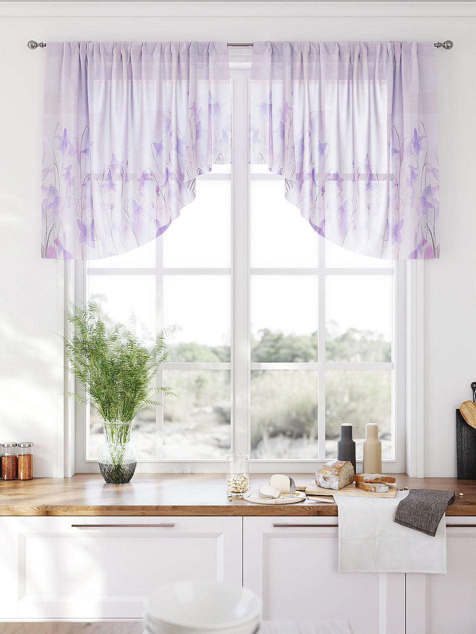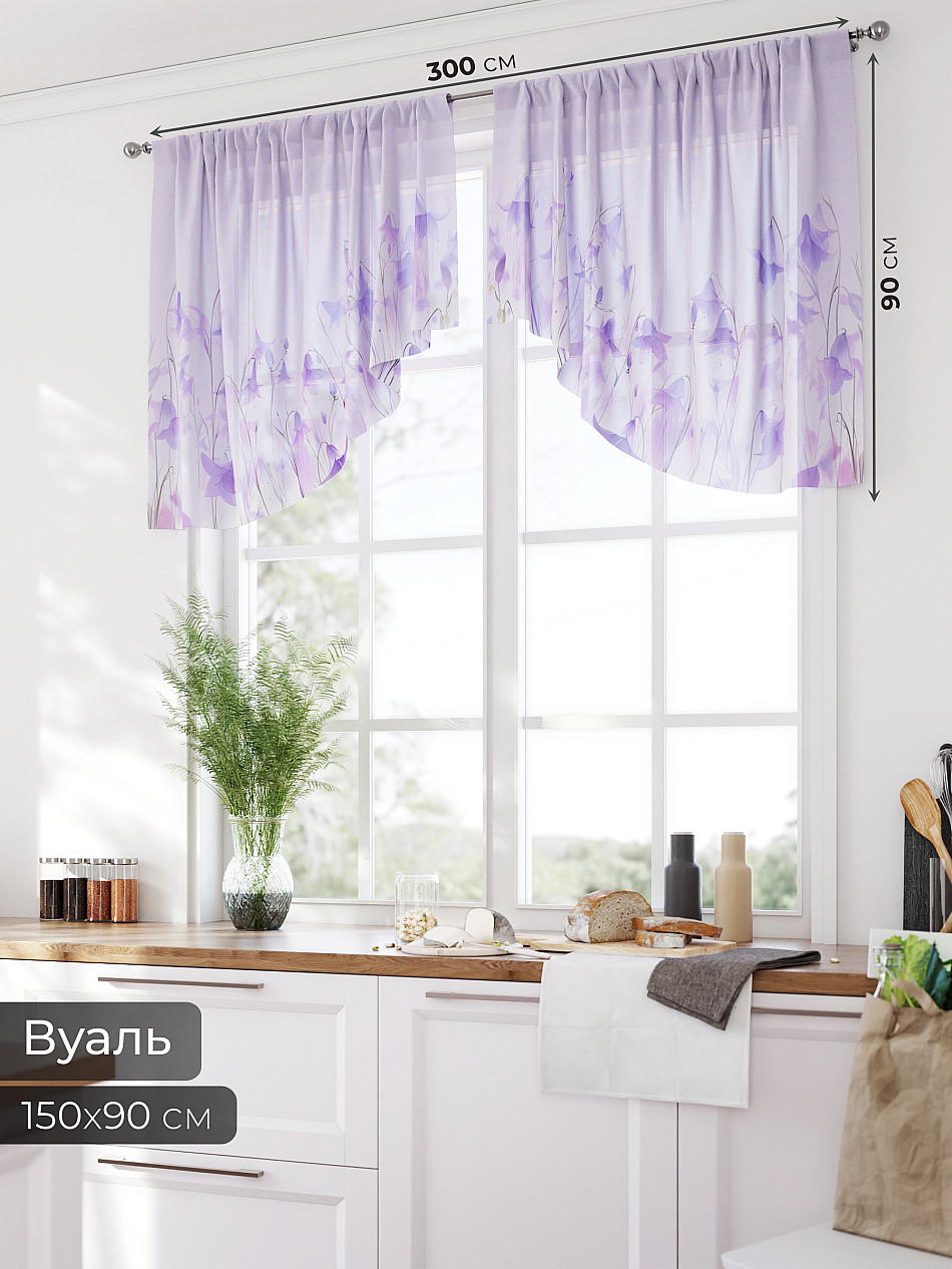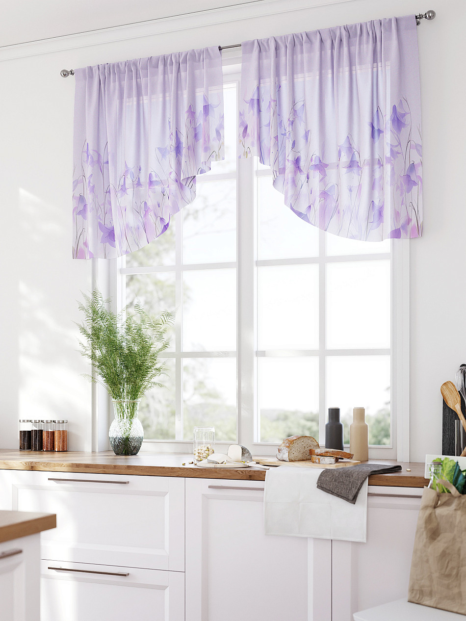 Комплект штор из легкой вуали оформлен печатным рисунком. Печатный рисунок дает широкие возможности обновить интерьер фактически нет требуя ремонта за счет огромного выбора. Ткани с печатным рисунком безопасны и не содержат токсичных веществ. Не смотря на то что, материал легкий, он имеет высокую плотность, мало загрязнятся и не требует особого ухода даже после стирки, что важно для кухонных занавесок. Шторы не выцветают, не растягиваются, превосходно драпируются, образуя струящиеся складки. Прекрасное решение для создания красоты и уюта с помощью уникальных дизайнов.
