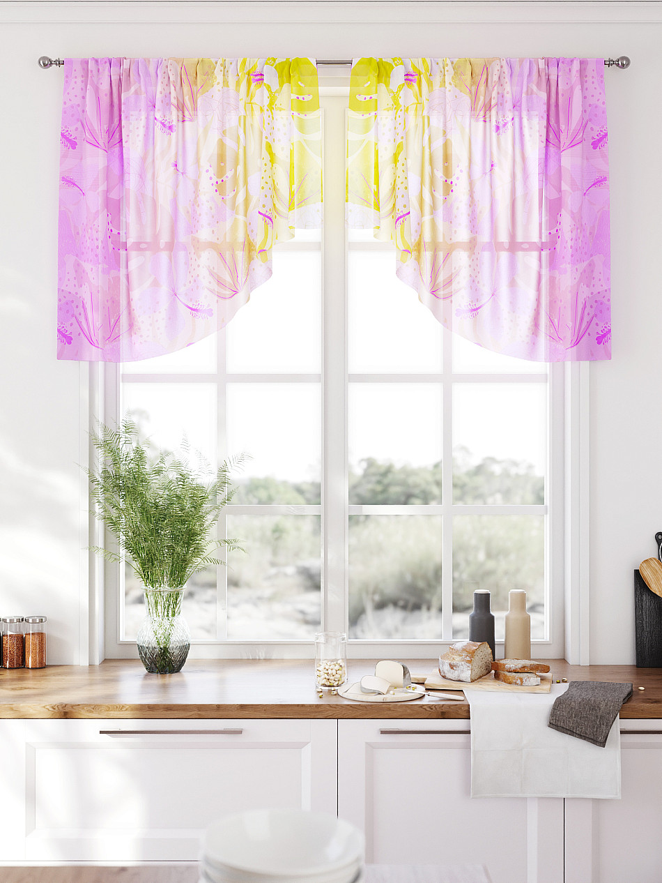 Комплект штор из легкой вуали оформлен печатным рисунком. Печатный рисунок дает широкие возможности обновить интерьер фактически нет требуя ремонта за счет огромного выбора. Ткани с печатным рисунком безопасны и не содержат токсичных веществ. Не смотря на то что, материал легкий, он имеет высокую плотность, мало загрязнятся и не требует особого ухода даже после стирки, что важно для кухонных занавесок. Шторы не выцветают, не растягиваются, превосходно драпируются, образуя струящиеся складки. Прекрасное решение для создания красоты и уюта с помощью уникальных дизайнов.