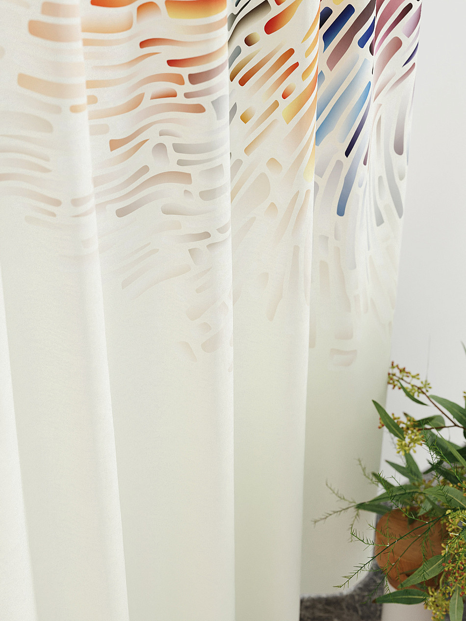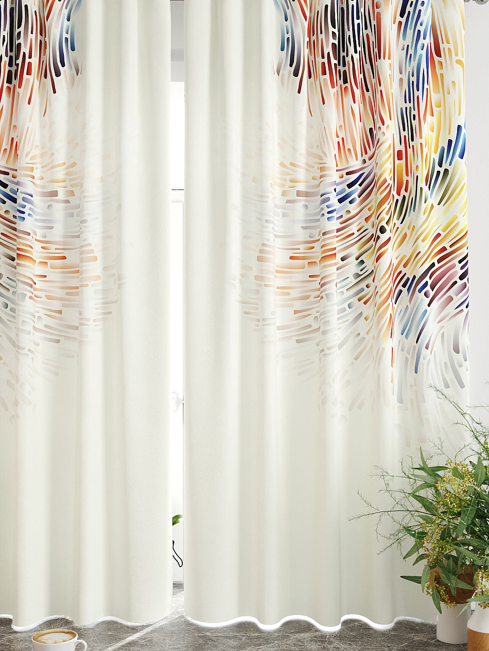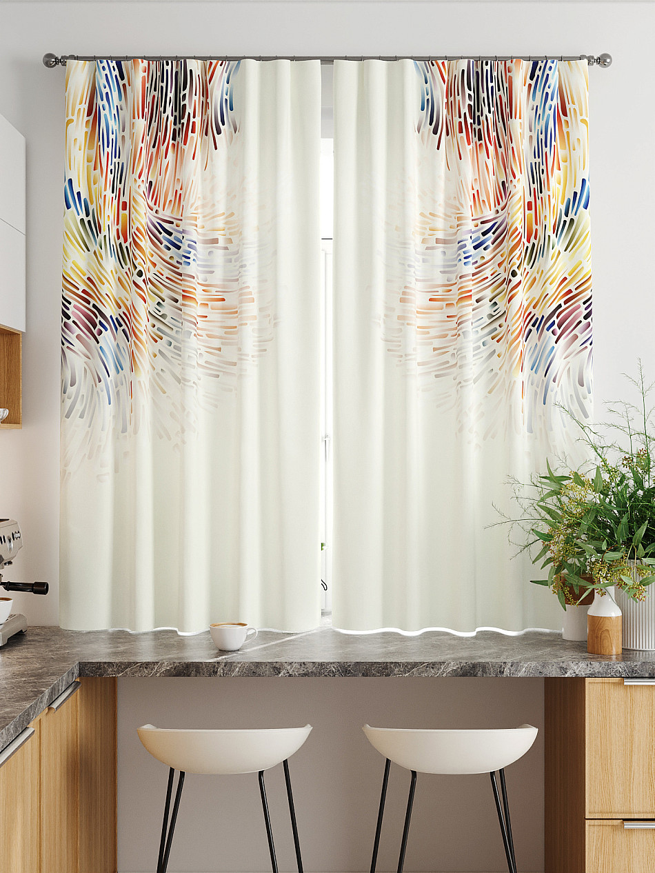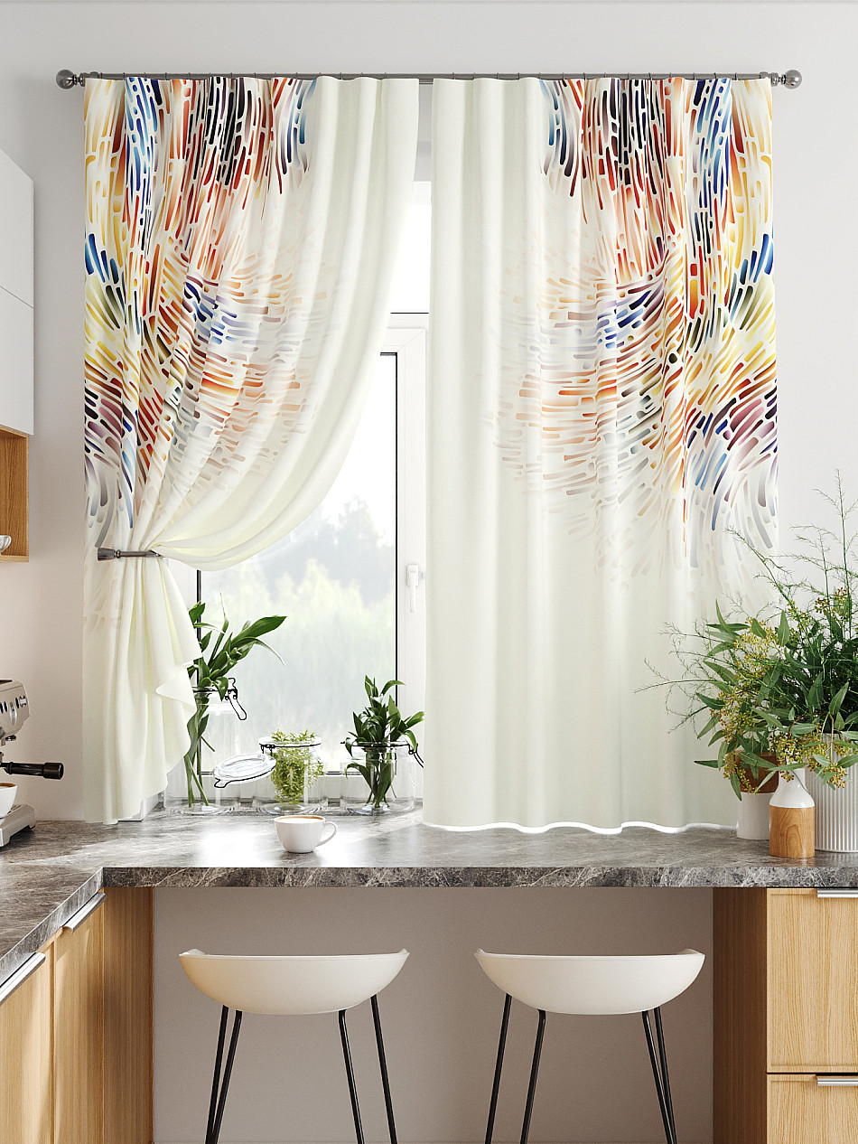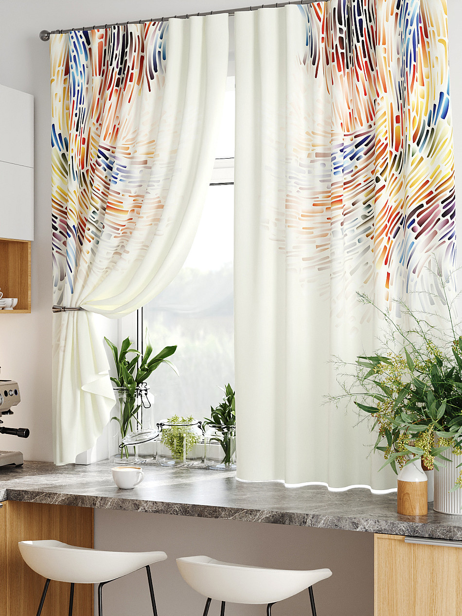 Комплект штор из легкой портьерной ткани (габардин) оформлен печатным рисунком. Печатный рисунок дает широкие возможности обновить интерьер фактически нет требуя ремонта за счет огромного выбора. Ткани с печатным рисунком безопасны и не содержат токсичных веществ. Не смотря на то что, материал легкий, он имеет высокую плотность, мало загрязнятся и не требует особого ухода даже после стирки, что важно для кухонных занавесок. Шторы не выцветают, не растягиваются, превосходно драпируются, образуя струящиеся складки. Прекрасное решение для создания красоты и уюта с помощью уникальных дизайнов.