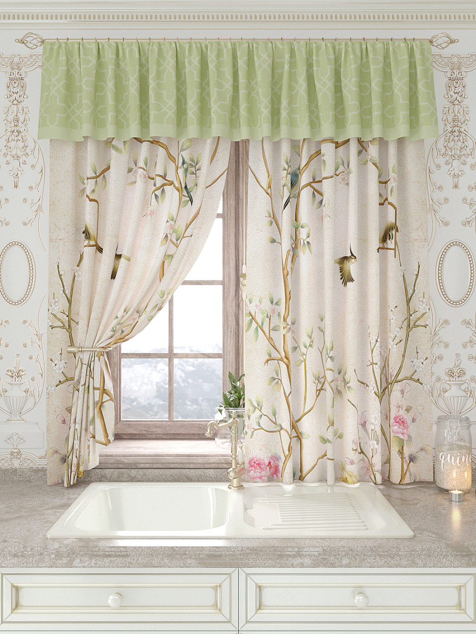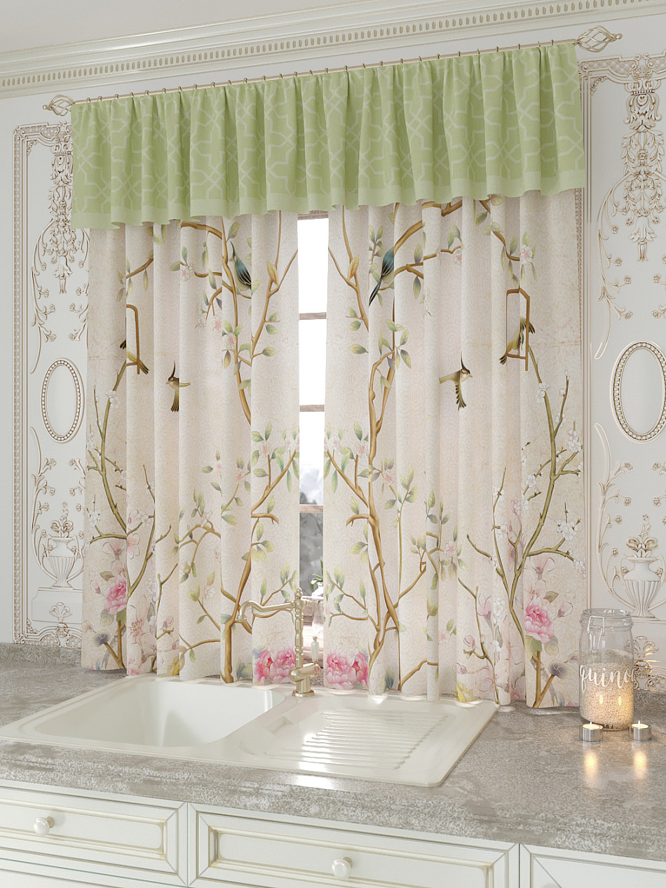Портьеры 150х160 см. — 2 шт., Ламбрекен 300х40 см. — 1 шт. Комплект штор из легкой портьерной ткани (габардин) оформлен печатным рисунком. Печатный рисунок дает широкие возможности обновить интерьер фактически не требуя ремонта за счет огромного выбора. Ткани с печатным рисунком безопасны и не содержат токсичных веществ. Не смотря на то, что материал легкий, он имеет высокую плотность, мало загрязнятся и не требует особого ухода даже после стирки, что важно для кухонных занавесок. Шторы не выцветают, не растягиваются, превосходно драпируются, образуя струящиеся складки. Прекрасное решение для создания красоты и уюта с помощью уникальных дизайнов.