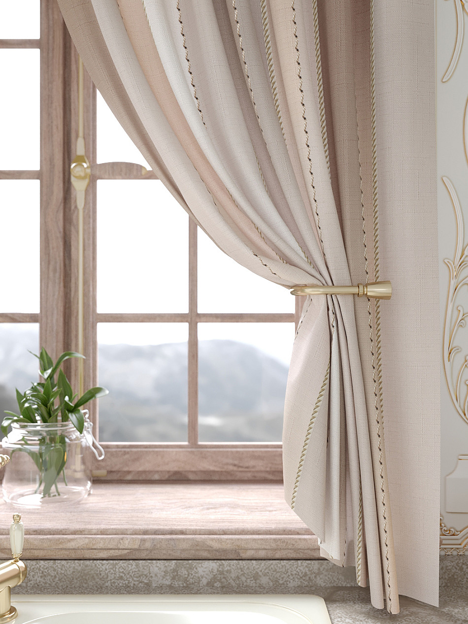 По верхнему краю портьер пришита шторная тесьма 6 см, с ее помощью затянув узелки от кордовых нитей с обеих сторон и стянув их до нужного размера можно сформировать округлые складки, далее вставить крючки в кармашки и повесить на карниз. Обязательно проверьте кордовые нити – они должны быть надежно завязаны, в противном случае во время стягивания они могут вылететь. Шторная тесьма имеет два ряда кармашков, с их помощью можно регулировать не только длину, но и ширину. Такое крепление подходит для всех типов карнизов.