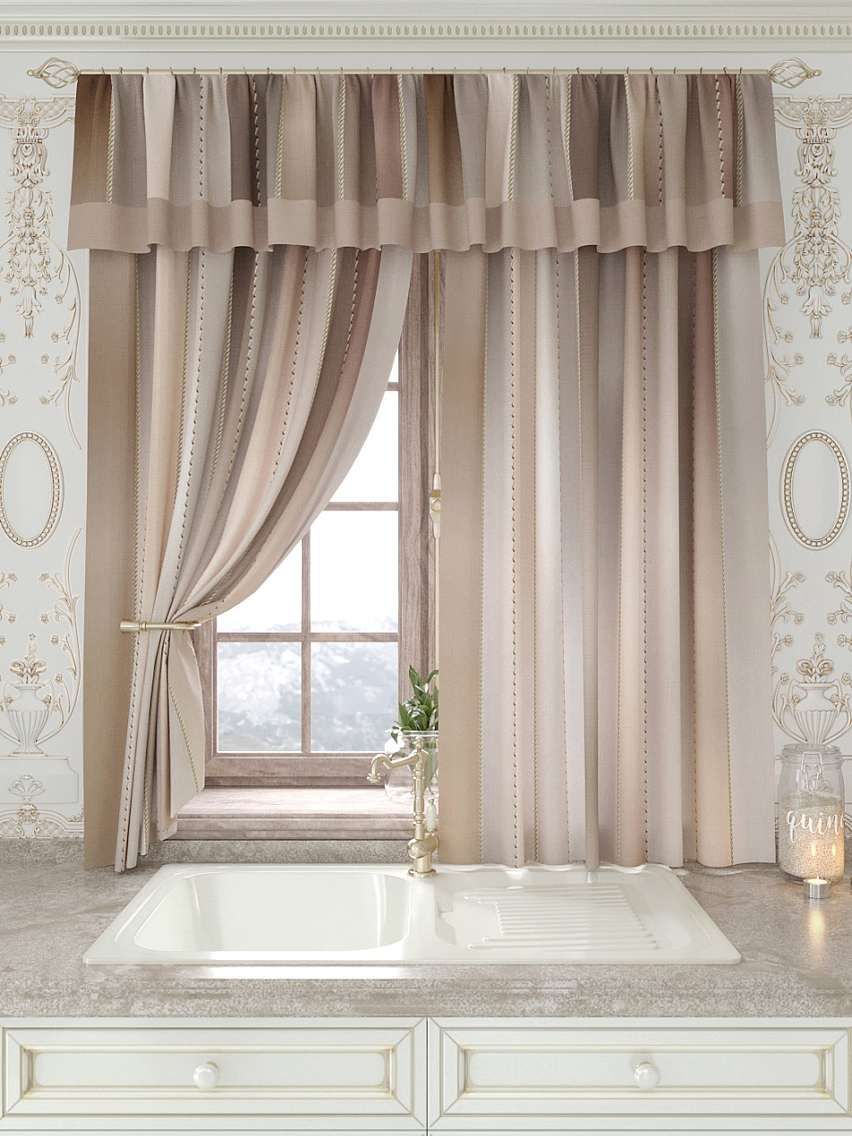Портьеры 150х160 см. — 2 шт., Ламбрекен 300х40 см. — 1 шт. Комплект штор из легкой портьерной ткани (габардин) оформлен печатным рисунком. Печатный рисунок дает широкие возможности обновить интерьер фактически не требуя ремонта за счет огромного выбора. Ткани с печатным рисунком безопасны и не содержат токсичных веществ. Не смотря на то, что материал легкий, он имеет высокую плотность, мало загрязнятся и не требует особого ухода даже после стирки, что важно для кухонных занавесок. Шторы не выцветают, не растягиваются, превосходно драпируются, образуя струящиеся складки. Прекрасное решение для создания красоты и уюта с помощью уникальных дизайнов.