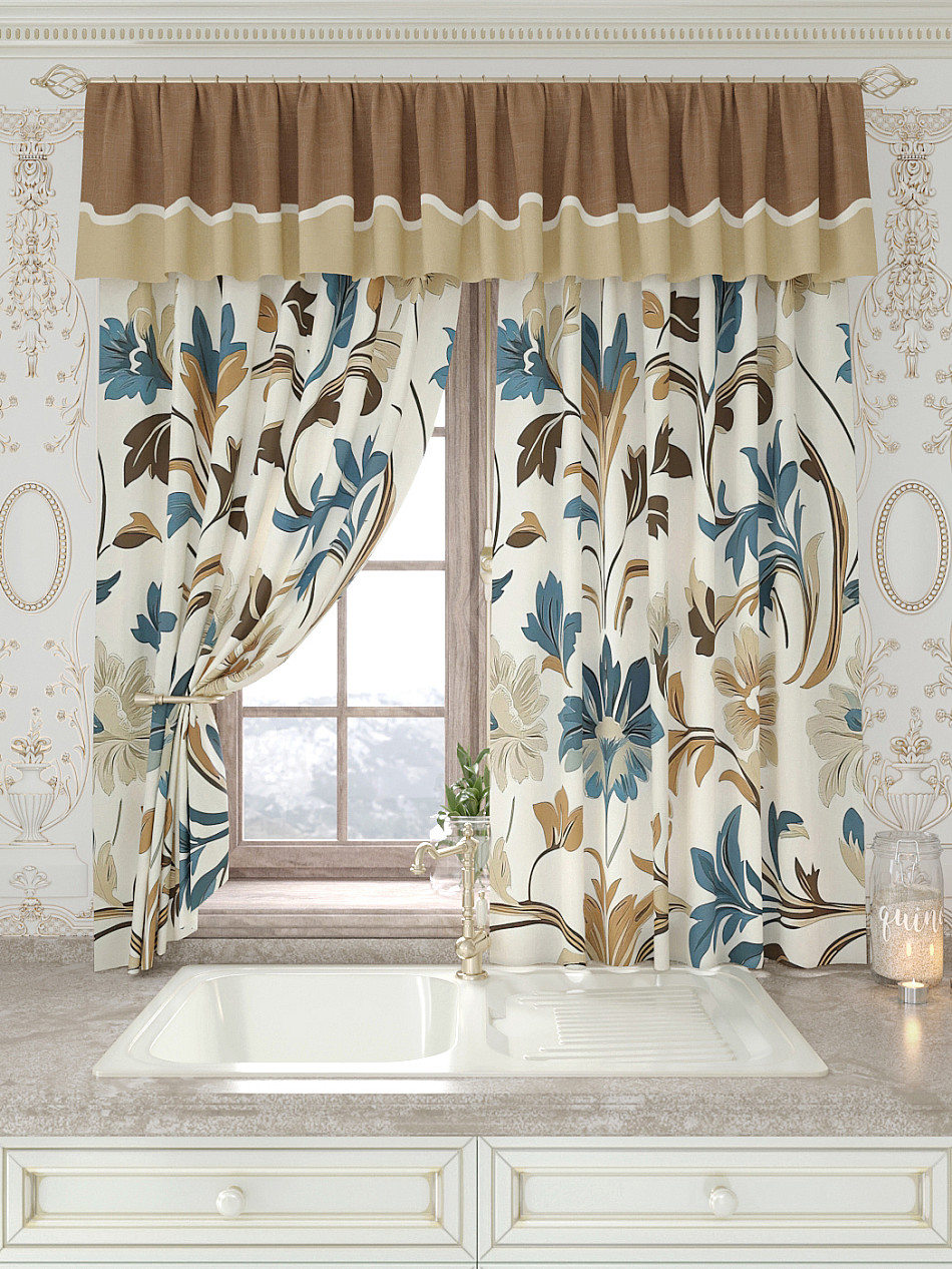 Портьеры 150х160 см. — 2 шт., Ламбрекен 300х40 см. — 1 шт. Комплект штор из легкой портьерной ткани (габардин) оформлен печатным рисунком. Печатный рисунок дает широкие возможности обновить интерьер фактически не требуя ремонта за счет огромного выбора. Ткани с печатным рисунком безопасны и не содержат токсичных веществ. Не смотря на то, что материал легкий, он имеет высокую плотность, мало загрязнятся и не требует особого ухода даже после стирки, что важно для кухонных занавесок. Шторы не выцветают, не растягиваются, превосходно драпируются, образуя струящиеся складки. Прекрасное решение для создания красоты и уюта с помощью уникальных дизайнов.