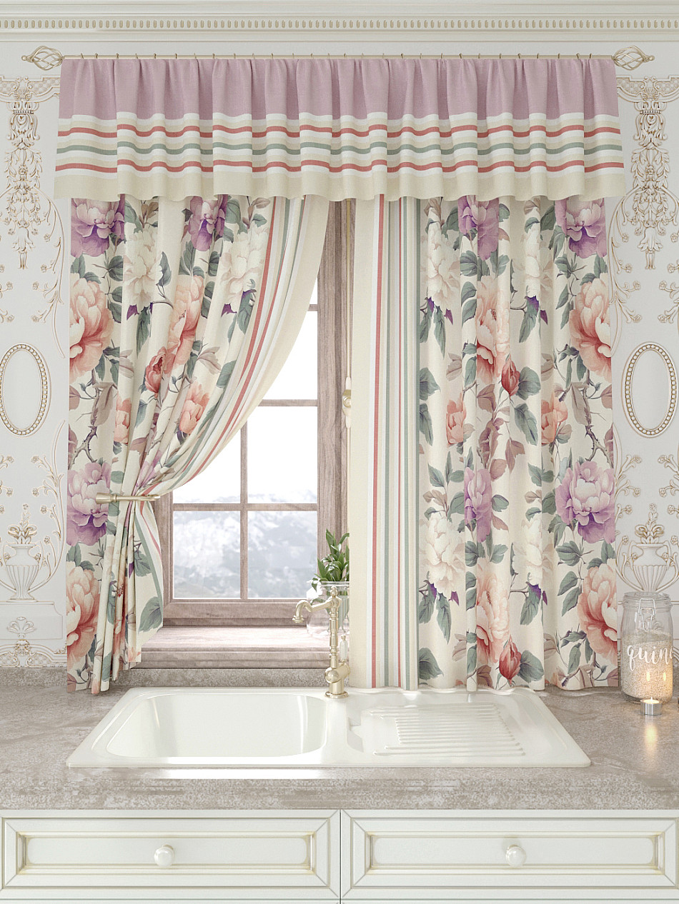 Портьеры 150х160 см. — 2 шт., Ламбрекен 300х40 см. — 1 шт. Комплект штор из легкой портьерной ткани (габардин) оформлен печатным рисунком. Печатный рисунок дает широкие возможности обновить интерьер фактически не требуя ремонта за счет огромного выбора. Ткани с печатным рисунком безопасны и не содержат токсичных веществ. Не смотря на то, что материал легкий, он имеет высокую плотность, мало загрязнятся и не требует особого ухода даже после стирки, что важно для кухонных занавесок. Шторы не выцветают, не растягиваются, превосходно драпируются, образуя струящиеся складки. Прекрасное решение для создания красоты и уюта с помощью уникальных дизайнов.