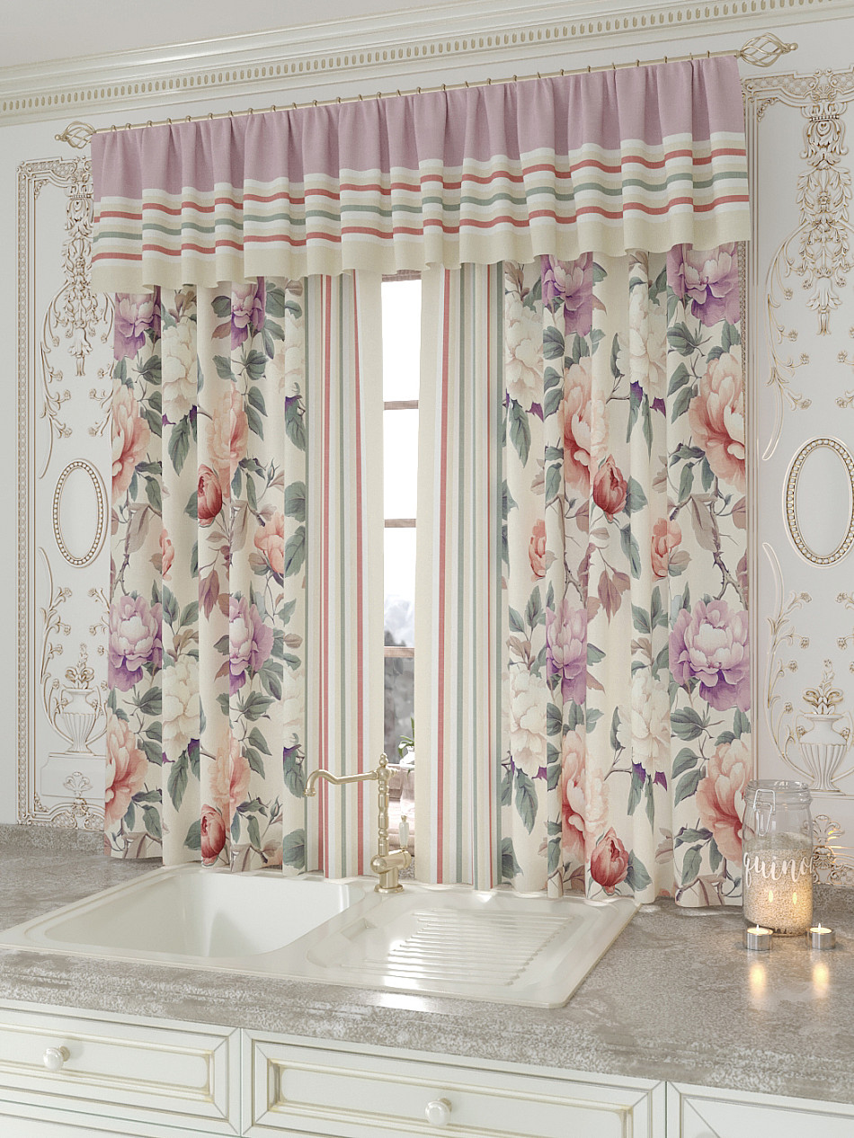 Портьеры 150х160 см. — 2 шт., Ламбрекен 300х40 см. — 1 шт. Комплект штор из легкой портьерной ткани (габардин) оформлен печатным рисунком. Печатный рисунок дает широкие возможности обновить интерьер фактически не требуя ремонта за счет огромного выбора. Ткани с печатным рисунком безопасны и не содержат токсичных веществ. Не смотря на то, что материал легкий, он имеет высокую плотность, мало загрязнятся и не требует особого ухода даже после стирки, что важно для кухонных занавесок. Шторы не выцветают, не растягиваются, превосходно драпируются, образуя струящиеся складки. Прекрасное решение для создания красоты и уюта с помощью уникальных дизайнов.