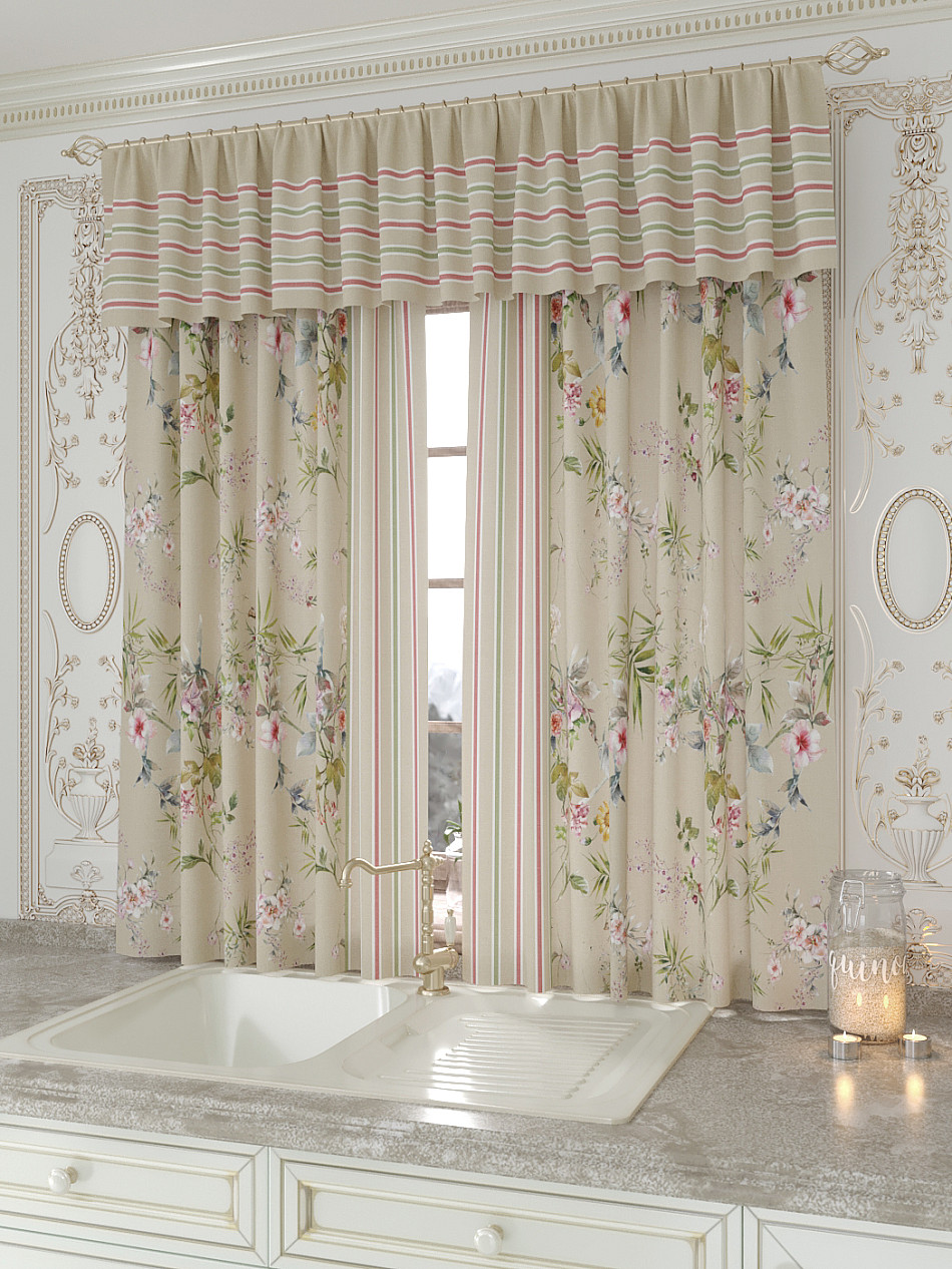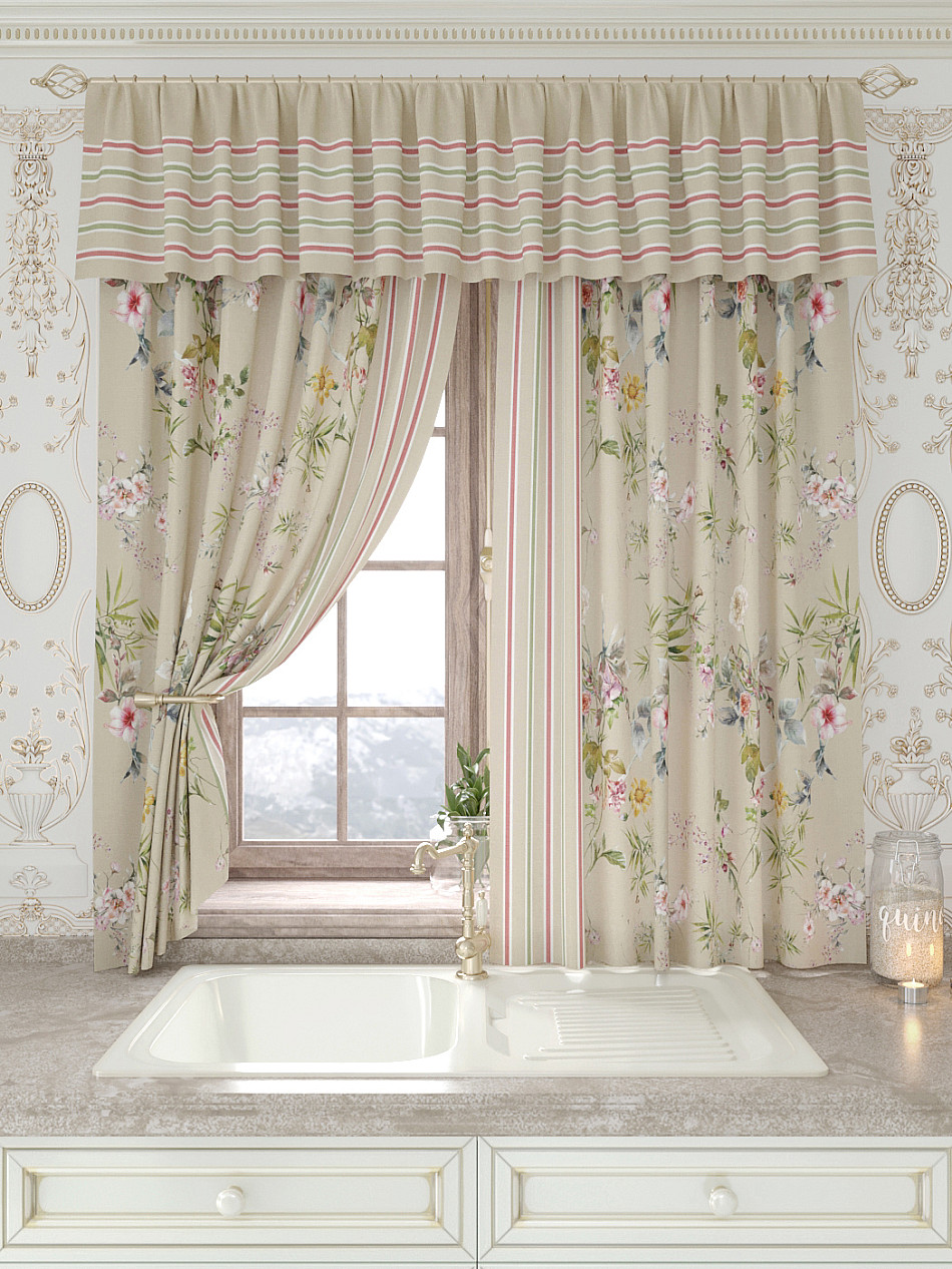 Портьеры 150х160 см. — 2 шт., Ламбрекен 300х40 см. — 1 шт. Комплект штор из легкой портьерной ткани (габардин) оформлен печатным рисунком. Печатный рисунок дает широкие возможности обновить интерьер фактически не требуя ремонта за счет огромного выбора. Ткани с печатным рисунком безопасны и не содержат токсичных веществ. Не смотря на то, что материал легкий, он имеет высокую плотность, мало загрязнятся и не требует особого ухода даже после стирки, что важно для кухонных занавесок. Шторы не выцветают, не растягиваются, превосходно драпируются, образуя струящиеся складки. Прекрасное решение для создания красоты и уюта с помощью уникальных дизайнов.