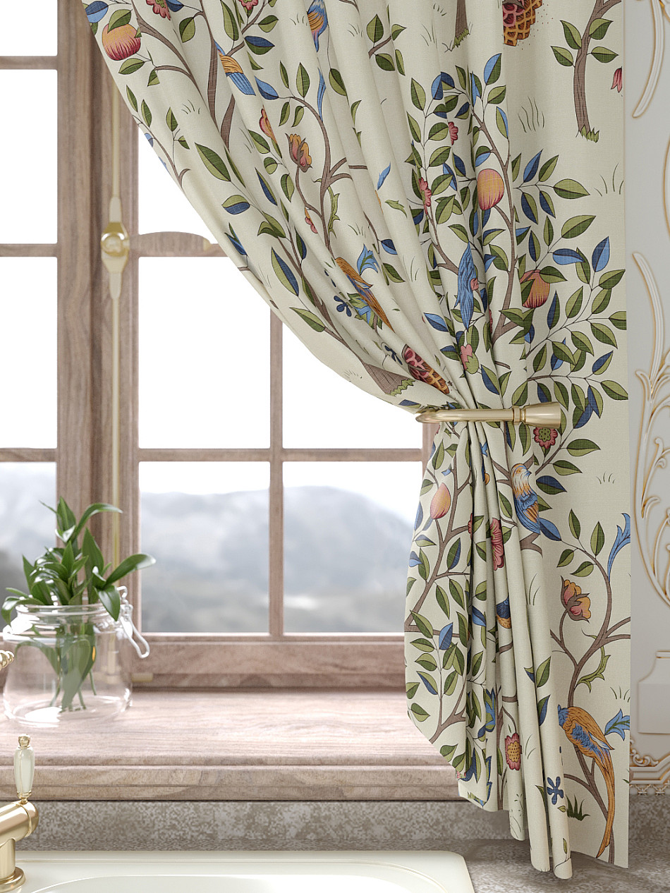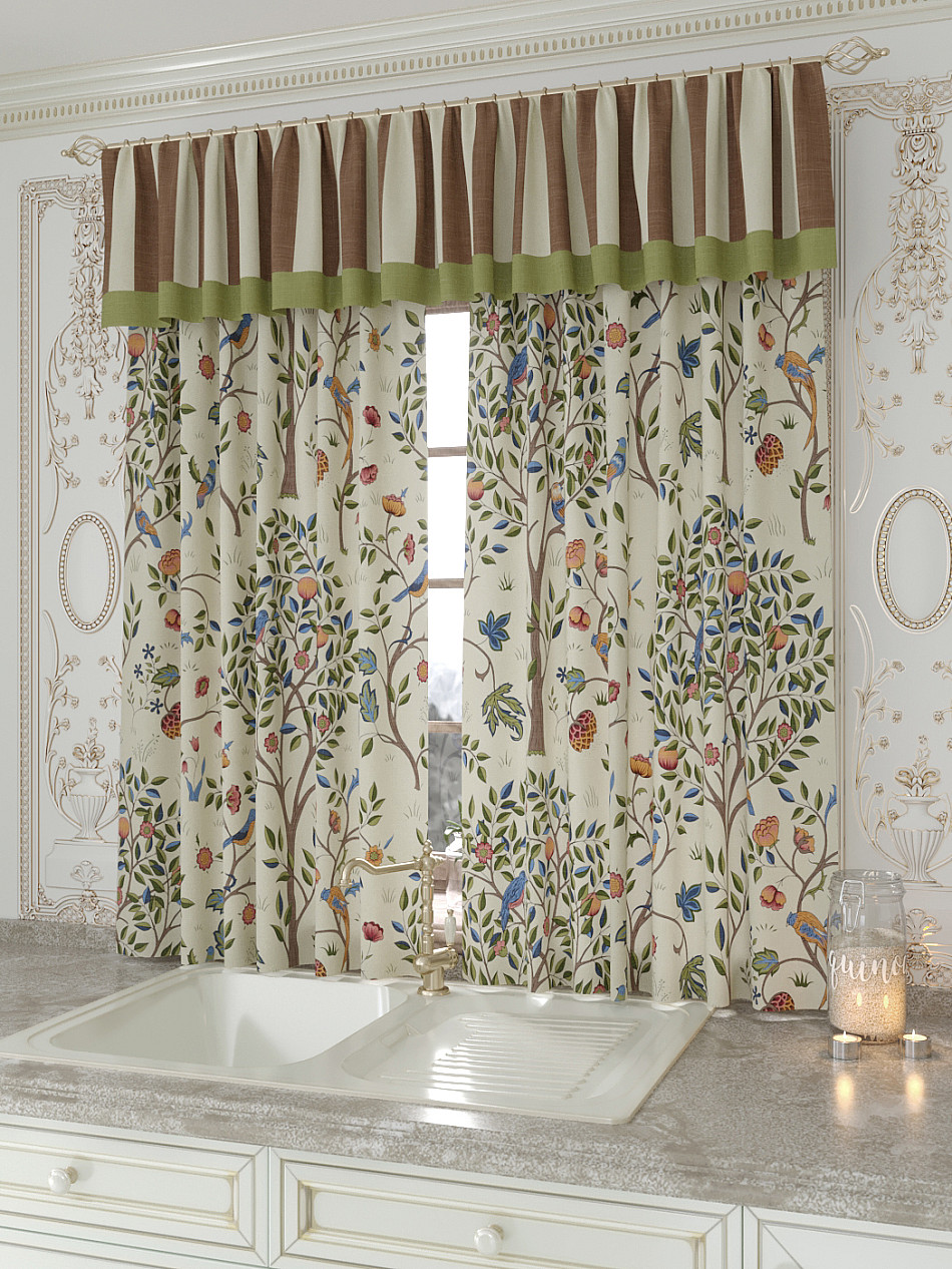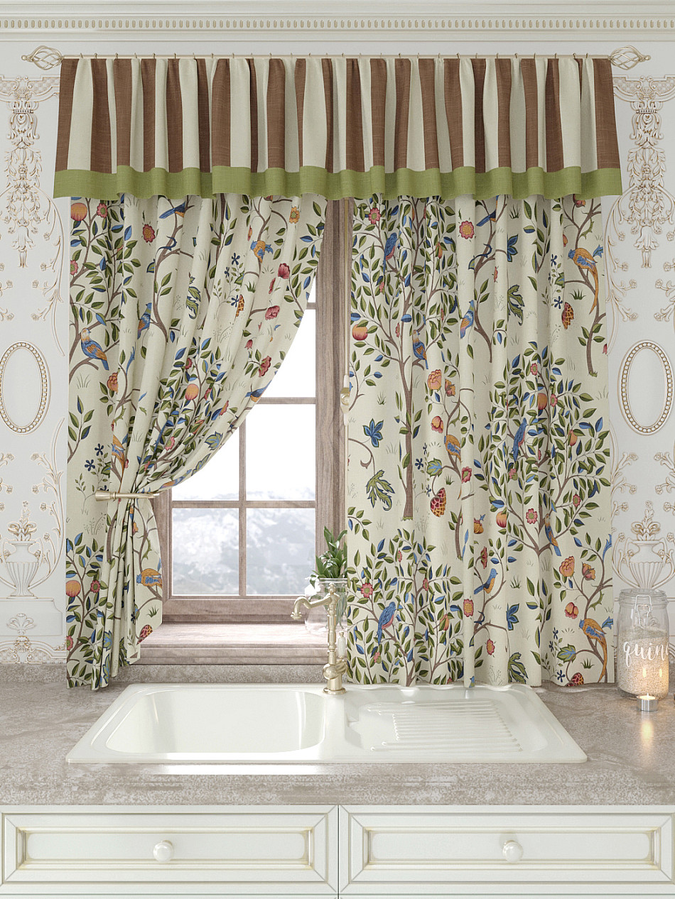 Портьеры 150х160 см. — 2 шт., Ламбрекен 300х40 см. — 1 шт. Комплект штор из легкой портьерной ткани (габардин) оформлен печатным рисунком. Печатный рисунок дает широкие возможности обновить интерьер фактически не требуя ремонта за счет огромного выбора. Ткани с печатным рисунком безопасны и не содержат токсичных веществ. Не смотря на то, что материал легкий, он имеет высокую плотность, мало загрязнятся и не требует особого ухода даже после стирки, что важно для кухонных занавесок. Шторы не выцветают, не растягиваются, превосходно драпируются, образуя струящиеся складки. Прекрасное решение для создания красоты и уюта с помощью уникальных дизайнов.