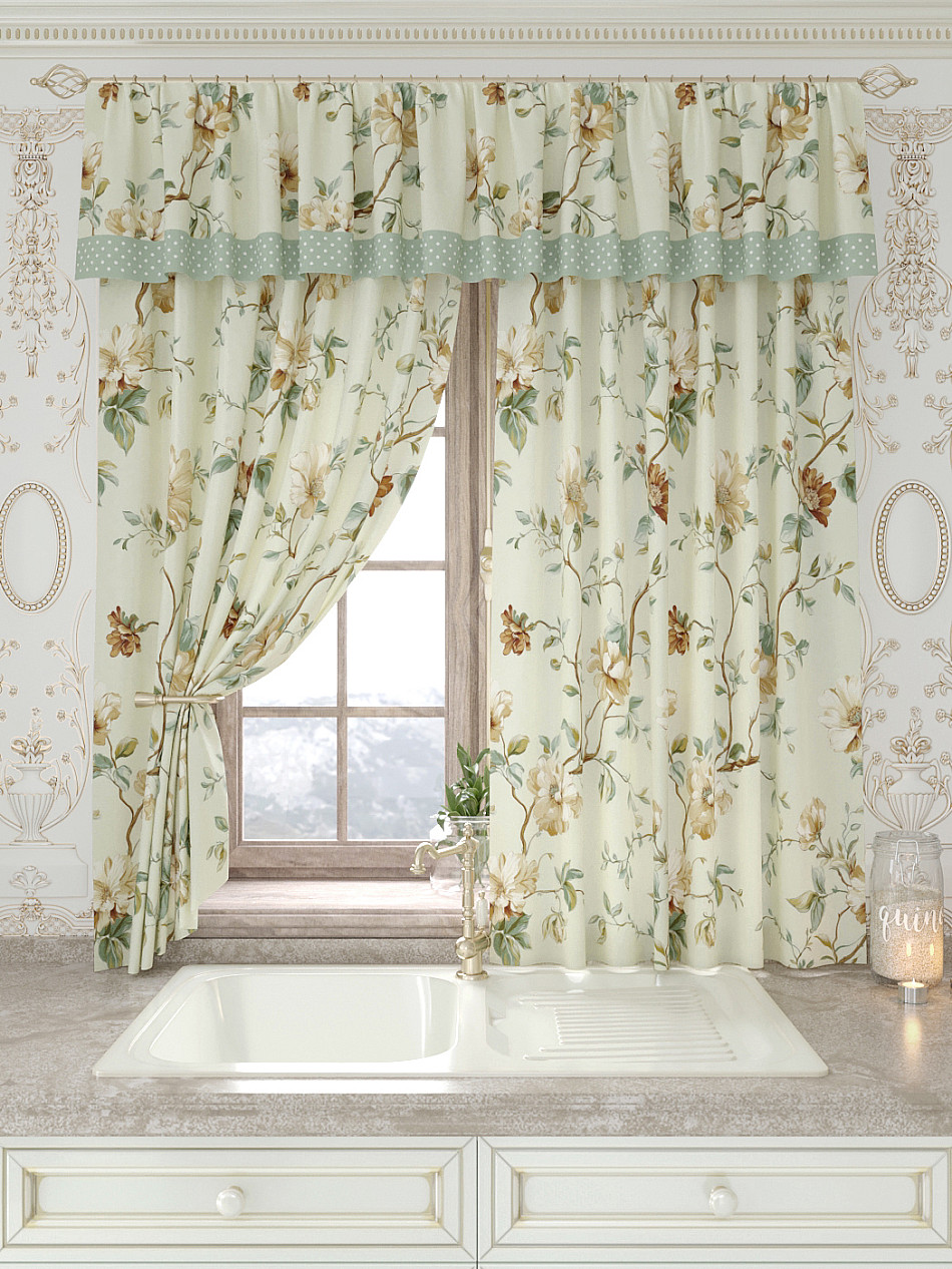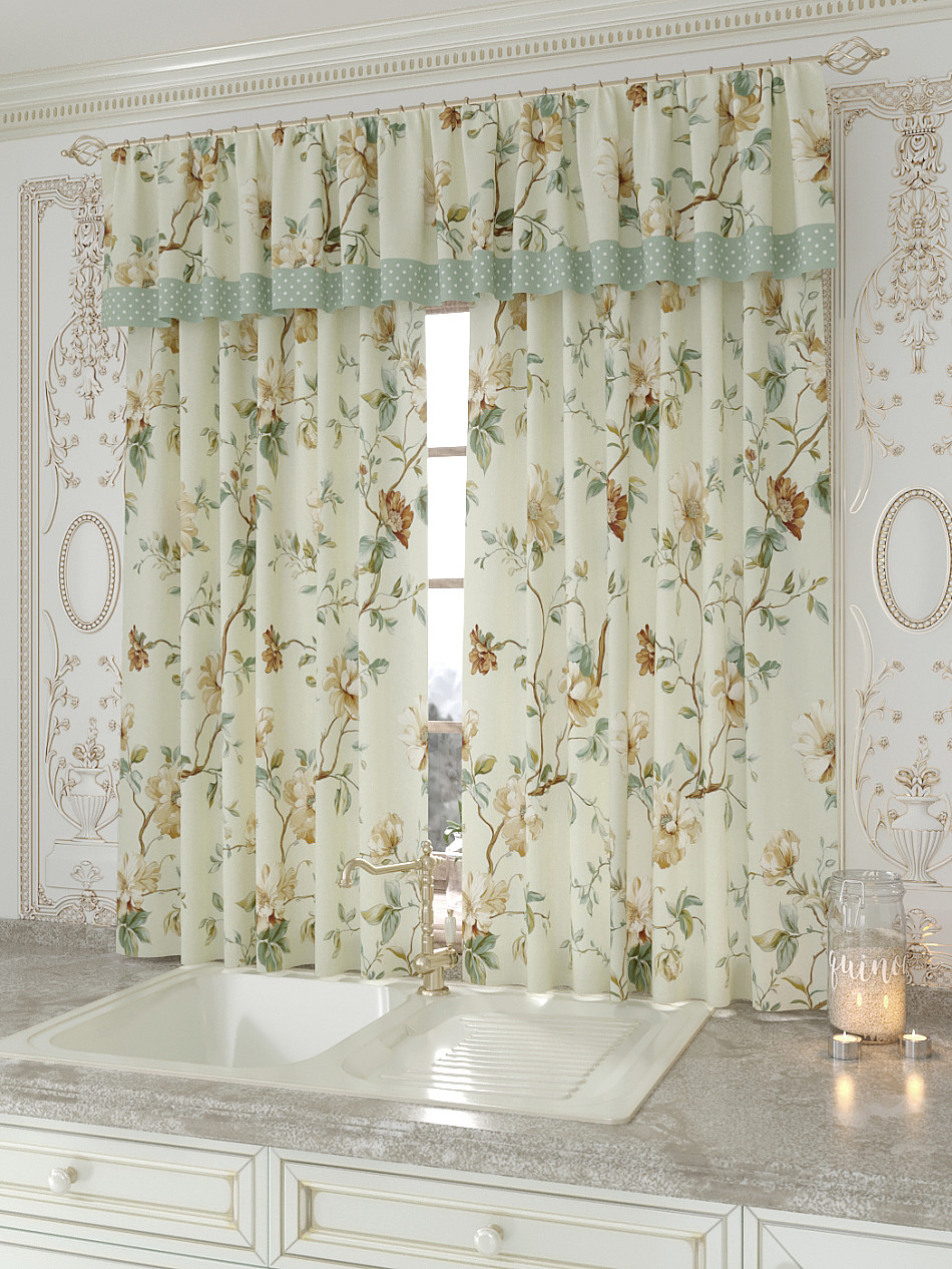 Портьеры 150х160 см. — 2 шт., Ламбрекен 300х40 см. — 1 шт. Комплект штор из легкой портьерной ткани (габардин) оформлен печатным рисунком. Печатный рисунок дает широкие возможности обновить интерьер фактически не требуя ремонта за счет огромного выбора. Ткани с печатным рисунком безопасны и не содержат токсичных веществ. Не смотря на то, что материал легкий, он имеет высокую плотность, мало загрязнятся и не требует особого ухода даже после стирки, что важно для кухонных занавесок. Шторы не выцветают, не растягиваются, превосходно драпируются, образуя струящиеся складки. Прекрасное решение для создания красоты и уюта с помощью уникальных дизайнов.