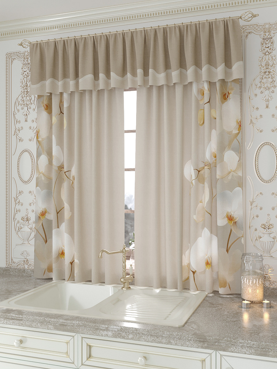 Портьеры 150х160 см. — 2 шт., Ламбрекен 300х40 см. — 1 шт. Комплект штор из легкой портьерной ткани (габардин) оформлен печатным рисунком. Печатный рисунок дает широкие возможности обновить интерьер фактически не требуя ремонта за счет огромного выбора. Ткани с печатным рисунком безопасны и не содержат токсичных веществ. Не смотря на то, что материал легкий, он имеет высокую плотность, мало загрязнятся и не требует особого ухода даже после стирки, что важно для кухонных занавесок. Шторы не выцветают, не растягиваются, превосходно драпируются, образуя струящиеся складки. Прекрасное решение для создания красоты и уюта с помощью уникальных дизайнов.