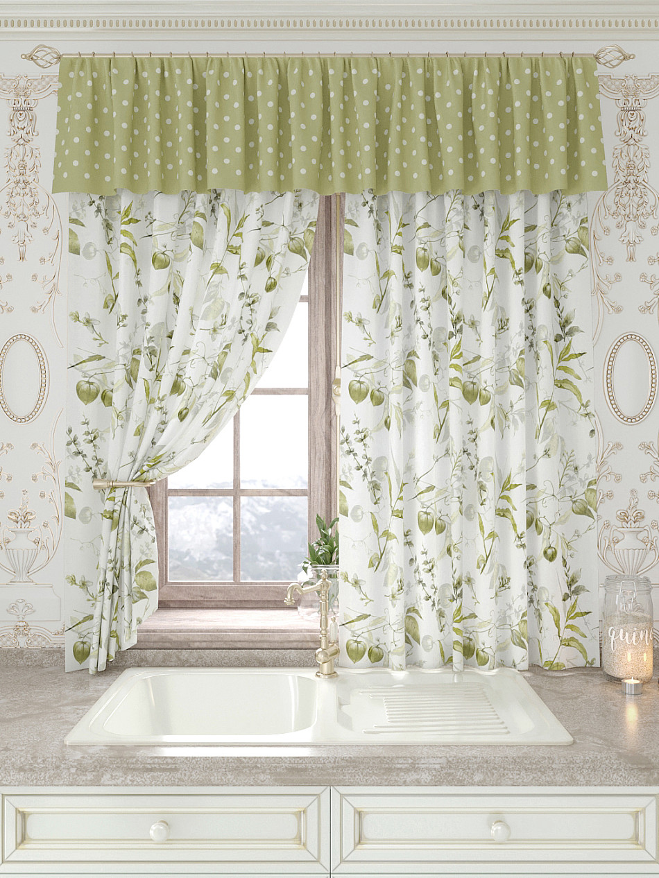 Портьеры 150х160 см. — 2 шт., Ламбрекен 300х40 см. — 1 шт. Комплект штор из легкой портьерной ткани (габардин) оформлен печатным рисунком. Печатный рисунок дает широкие возможности обновить интерьер фактически не требуя ремонта за счет огромного выбора. Ткани с печатным рисунком безопасны и не содержат токсичных веществ. Не смотря на то, что материал легкий, он имеет высокую плотность, мало загрязнятся и не требует особого ухода даже после стирки, что важно для кухонных занавесок. Шторы не выцветают, не растягиваются, превосходно драпируются, образуя струящиеся складки. Прекрасное решение для создания красоты и уюта с помощью уникальных дизайнов.