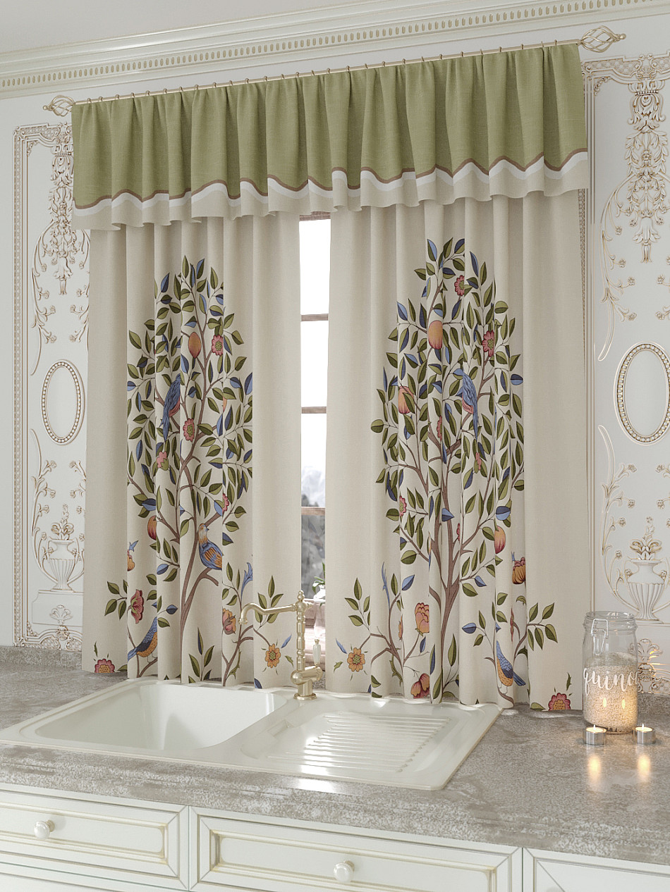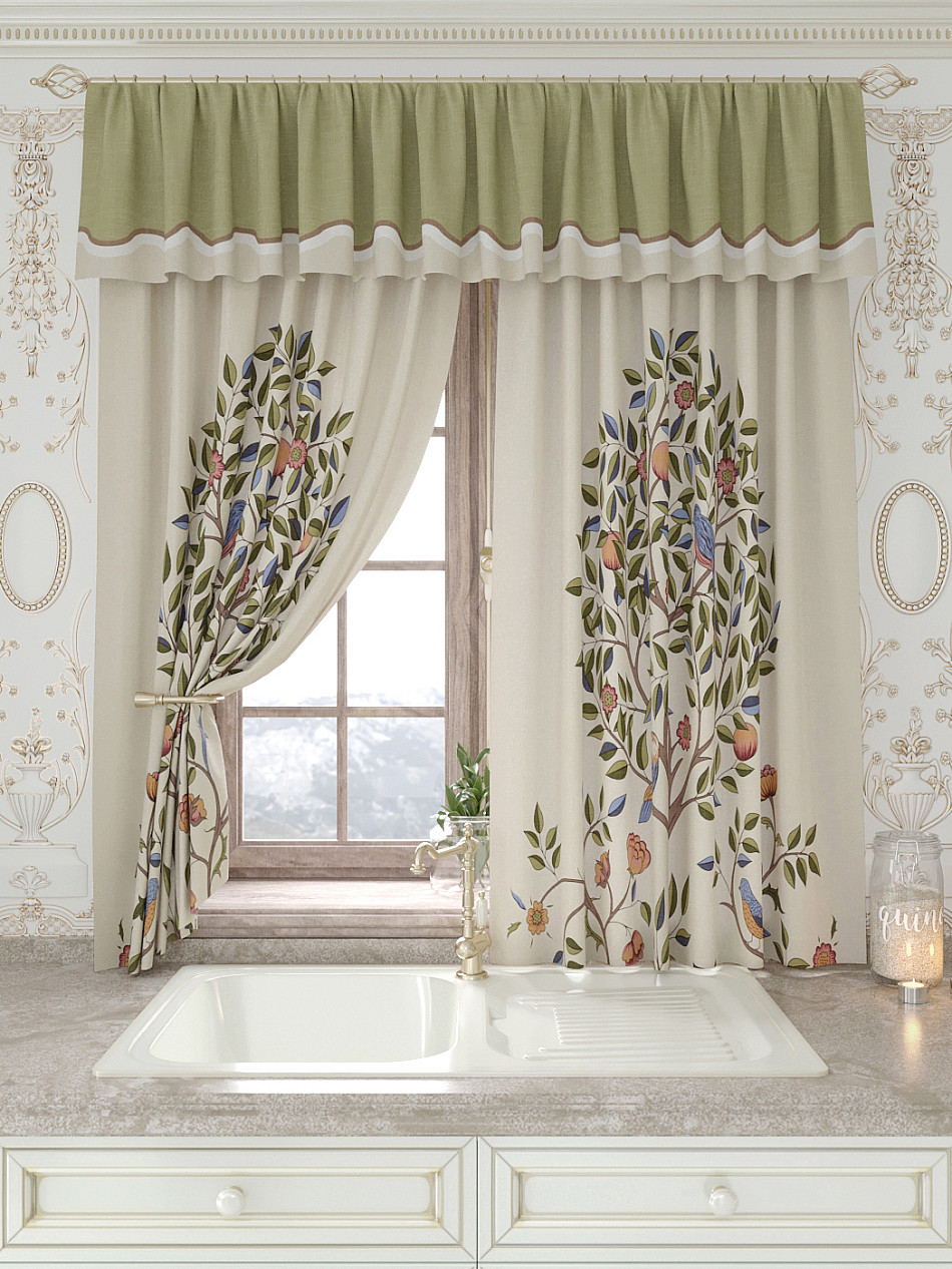 Портьеры 150х160 см. — 2 шт., Ламбрекен 300х40 см. — 1 шт. Комплект штор из легкой портьерной ткани (габардин) оформлен печатным рисунком. Печатный рисунок дает широкие возможности обновить интерьер фактически не требуя ремонта за счет огромного выбора. Ткани с печатным рисунком безопасны и не содержат токсичных веществ. Не смотря на то, что материал легкий, он имеет высокую плотность, мало загрязнятся и не требует особого ухода даже после стирки, что важно для кухонных занавесок. Шторы не выцветают, не растягиваются, превосходно драпируются, образуя струящиеся складки. Прекрасное решение для создания красоты и уюта с помощью уникальных дизайнов.