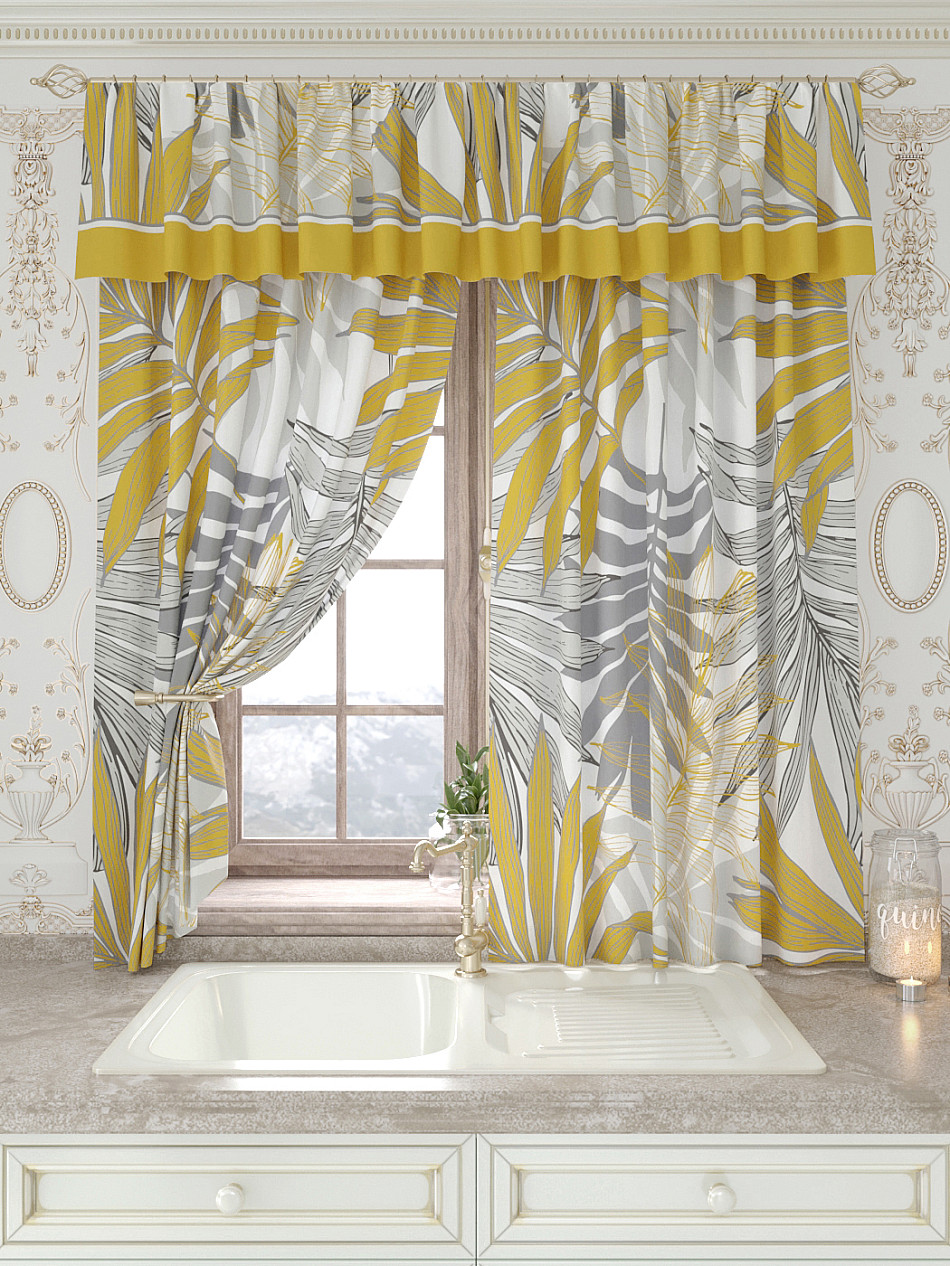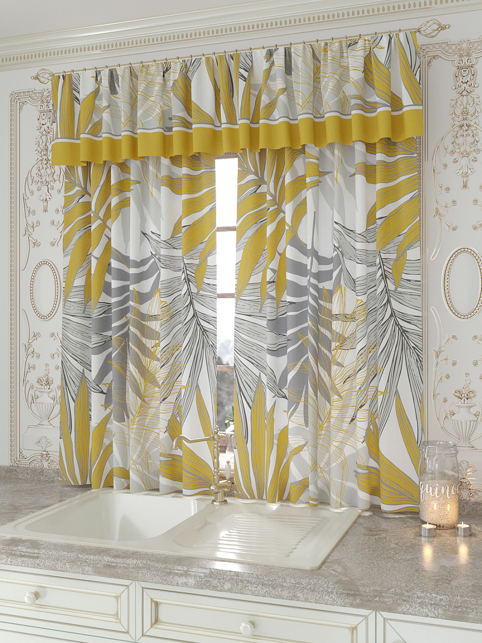 Портьеры 150х160 см. — 2 шт., Ламбрекен 300х40 см. — 1 шт. Комплект штор из легкой портьерной ткани (габардин) оформлен печатным рисунком. Печатный рисунок дает широкие возможности обновить интерьер фактически не требуя ремонта за счет огромного выбора. Ткани с печатным рисунком безопасны и не содержат токсичных веществ. Не смотря на то, что материал легкий, он имеет высокую плотность, мало загрязнятся и не требует особого ухода даже после стирки, что важно для кухонных занавесок. Шторы не выцветают, не растягиваются, превосходно драпируются, образуя струящиеся складки. Прекрасное решение для создания красоты и уюта с помощью уникальных дизайнов.
