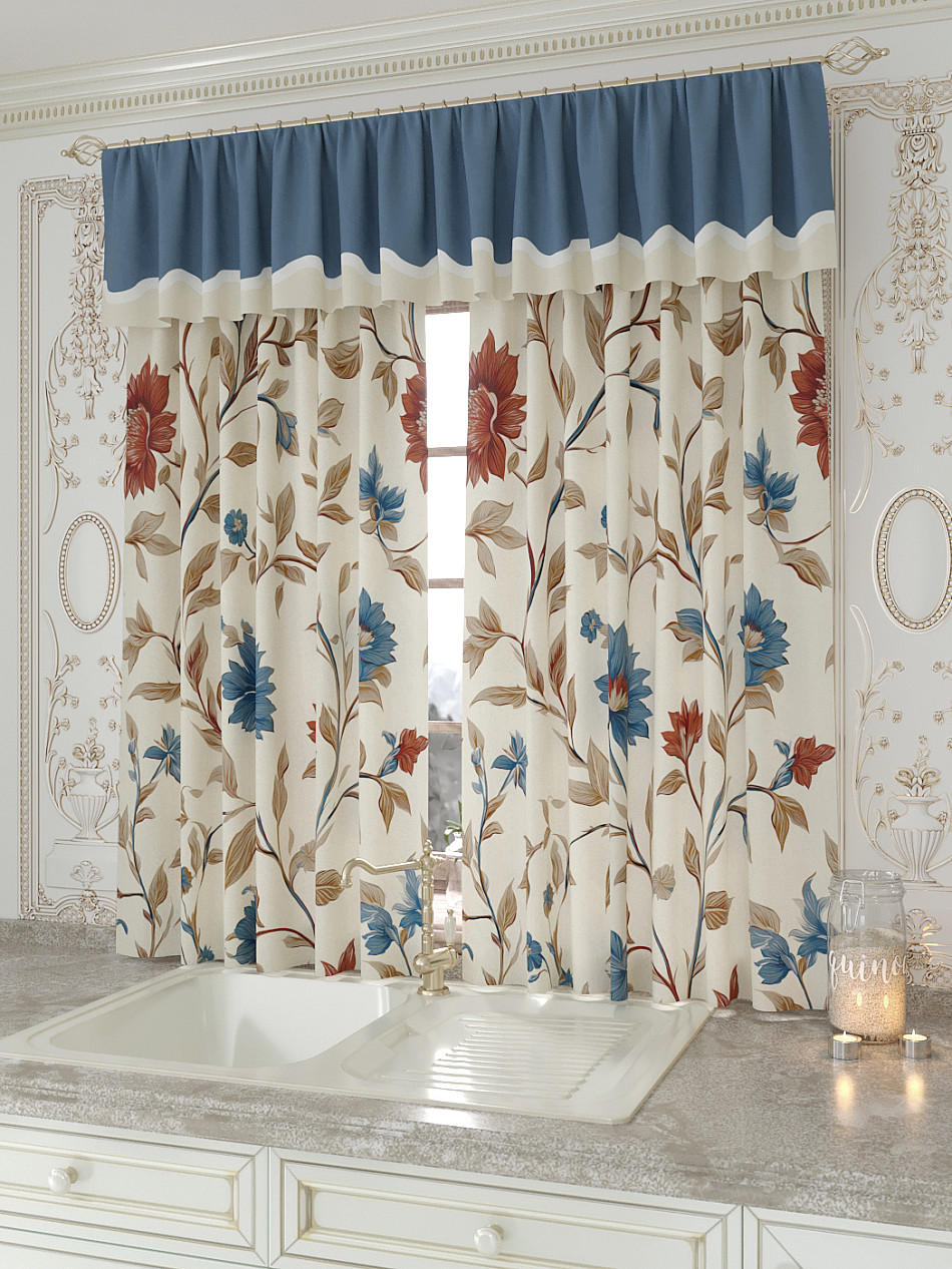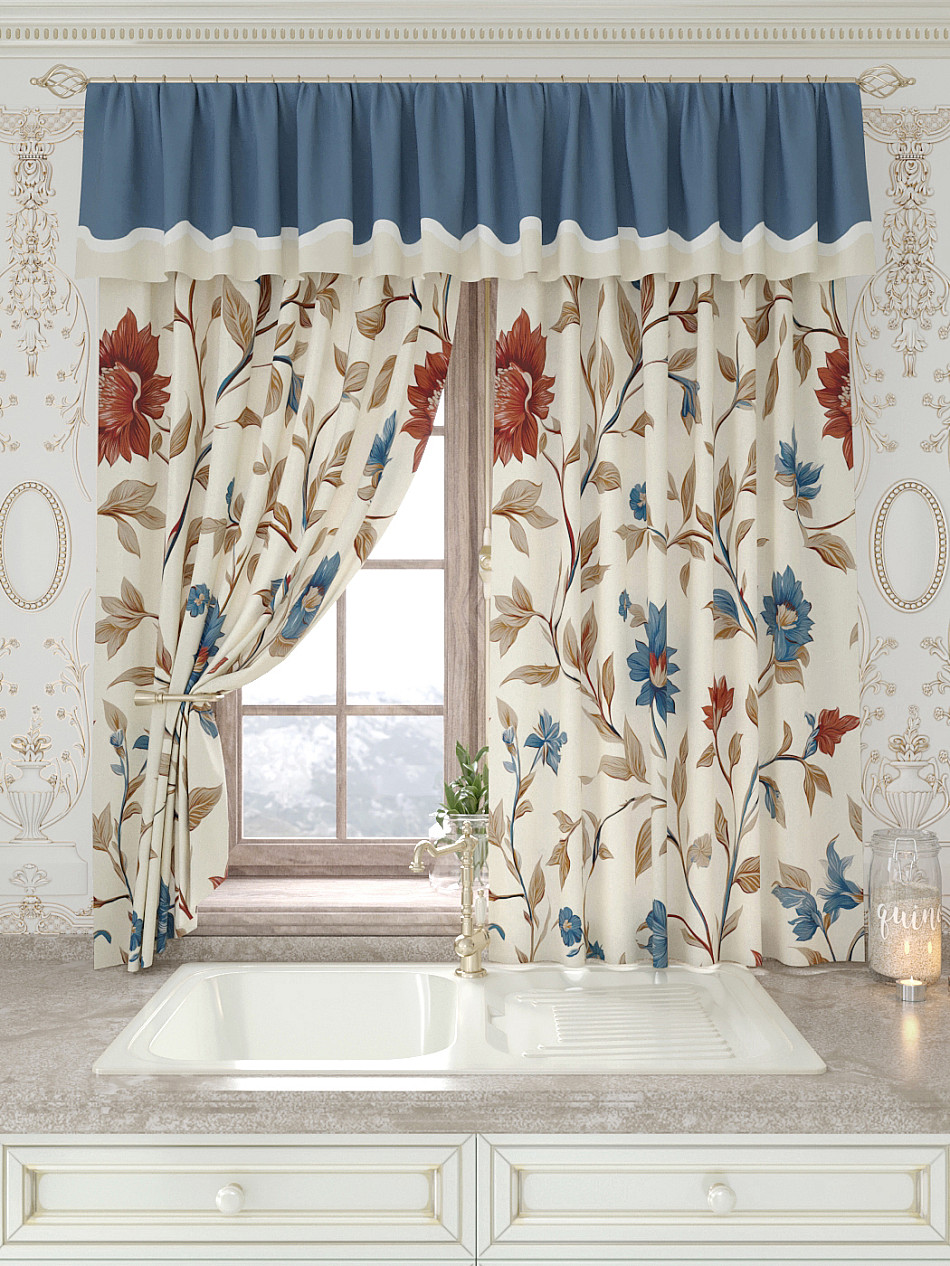 Портьеры 150х160 см. — 2 шт., Ламбрекен 300х40 см. — 1 шт. Комплект штор из легкой портьерной ткани (габардин) оформлен печатным рисунком. Печатный рисунок дает широкие возможности обновить интерьер фактически не требуя ремонта за счет огромного выбора. Ткани с печатным рисунком безопасны и не содержат токсичных веществ. Не смотря на то, что материал легкий, он имеет высокую плотность, мало загрязнятся и не требует особого ухода даже после стирки, что важно для кухонных занавесок. Шторы не выцветают, не растягиваются, превосходно драпируются, образуя струящиеся складки. Прекрасное решение для создания красоты и уюта с помощью уникальных дизайнов.
