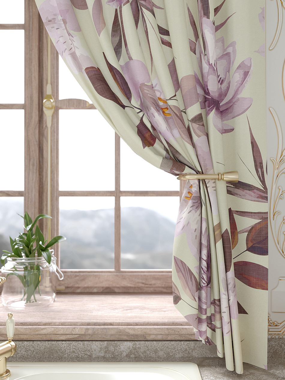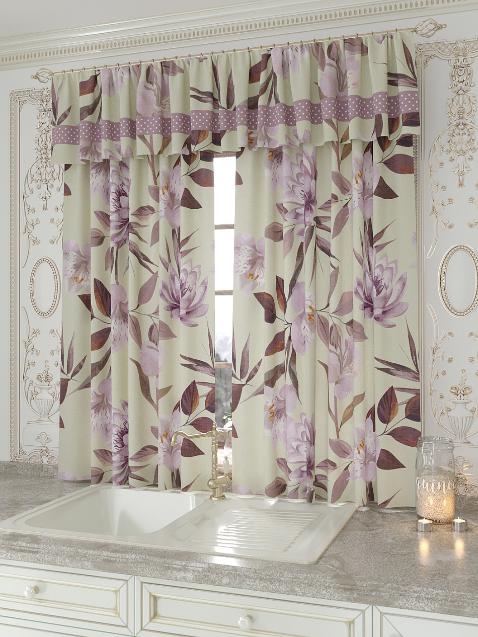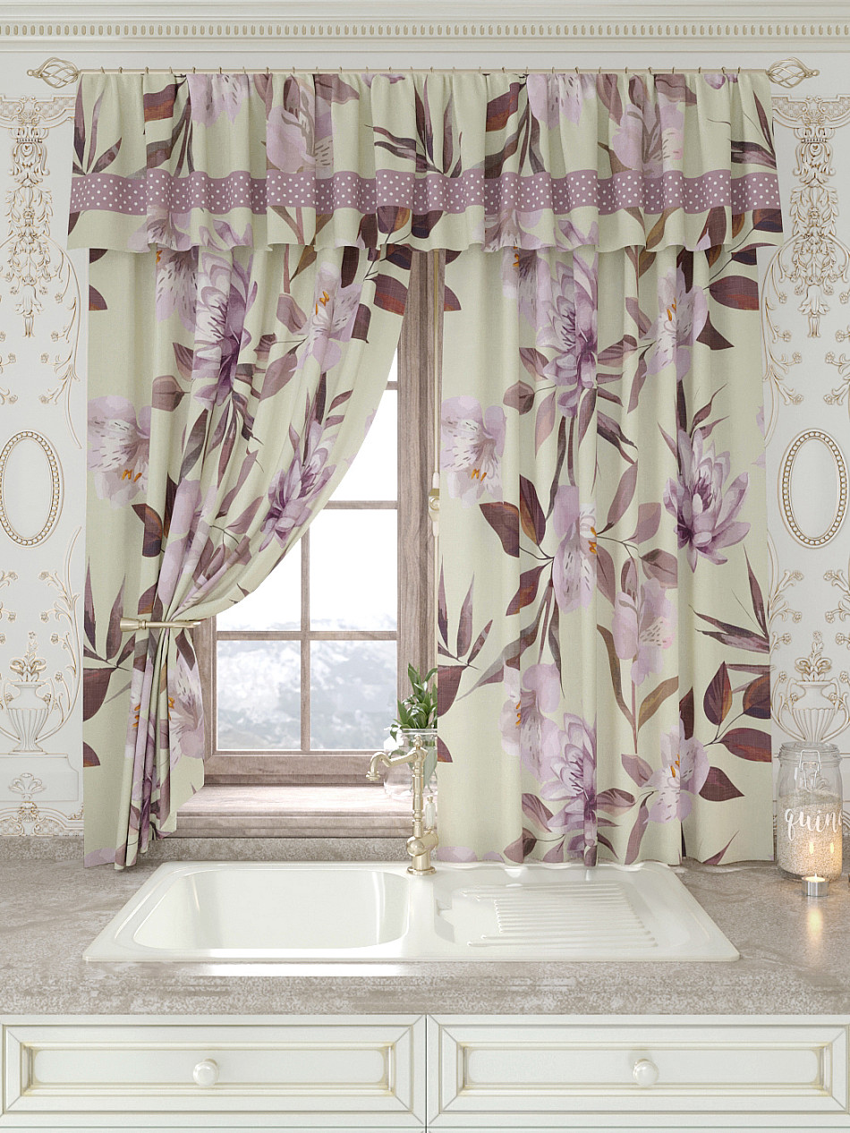 Портьеры 150х160 см. — 2 шт., Ламбрекен 300х40 см. — 1 шт. Комплект штор из легкой портьерной ткани (габардин) оформлен печатным рисунком. Печатный рисунок дает широкие возможности обновить интерьер фактически не требуя ремонта за счет огромного выбора. Ткани с печатным рисунком безопасны и не содержат токсичных веществ. Не смотря на то, что материал легкий, он имеет высокую плотность, мало загрязнятся и не требует особого ухода даже после стирки, что важно для кухонных занавесок. Шторы не выцветают, не растягиваются, превосходно драпируются, образуя струящиеся складки. Прекрасное решение для создания красоты и уюта с помощью уникальных дизайнов.