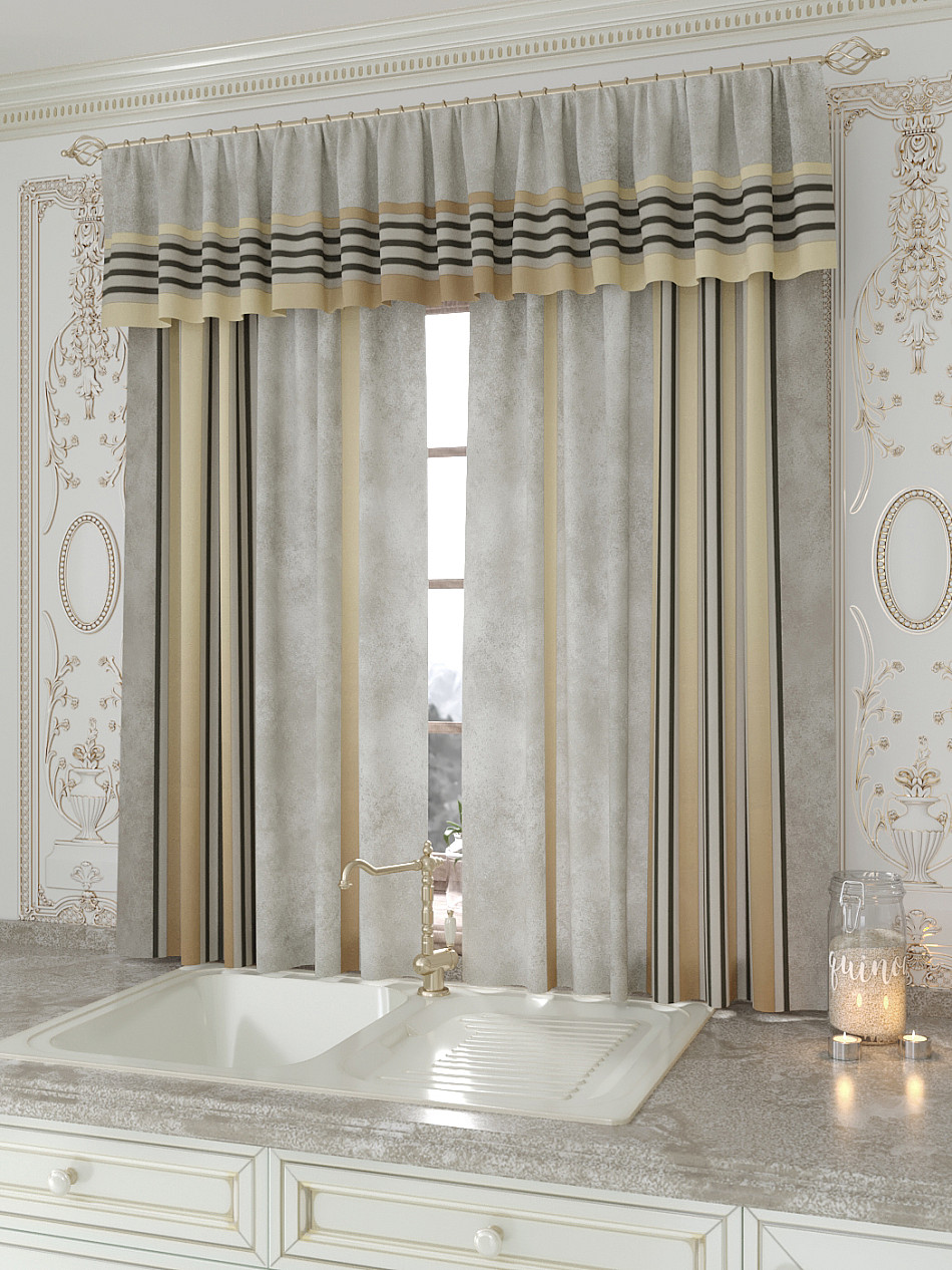 Портьеры 150х160 см. — 2 шт., Ламбрекен 300х40 см. — 1 шт. Комплект штор из легкой портьерной ткани (габардин) оформлен печатным рисунком. Печатный рисунок дает широкие возможности обновить интерьер фактически не требуя ремонта за счет огромного выбора. Ткани с печатным рисунком безопасны и не содержат токсичных веществ. Не смотря на то, что материал легкий, он имеет высокую плотность, мало загрязнятся и не требует особого ухода даже после стирки, что важно для кухонных занавесок. Шторы не выцветают, не растягиваются, превосходно драпируются, образуя струящиеся складки. Прекрасное решение для создания красоты и уюта с помощью уникальных дизайнов.