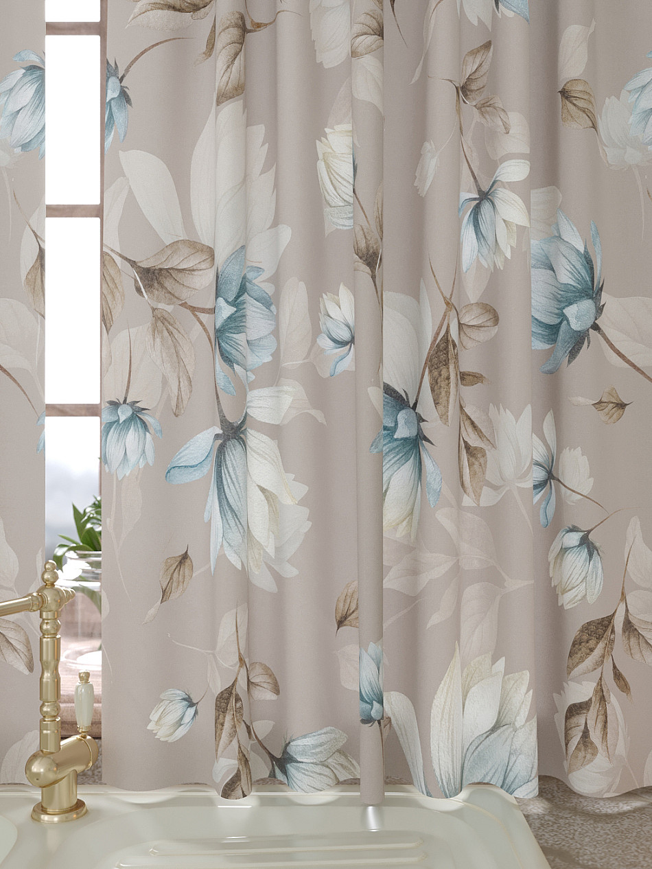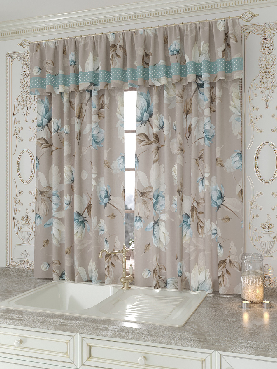 Портьеры 150х160 см. — 2 шт., Ламбрекен 300х40 см. — 1 шт. Комплект штор из легкой портьерной ткани (габардин) оформлен печатным рисунком. Печатный рисунок дает широкие возможности обновить интерьер фактически не требуя ремонта за счет огромного выбора. Ткани с печатным рисунком безопасны и не содержат токсичных веществ. Не смотря на то, что материал легкий, он имеет высокую плотность, мало загрязнятся и не требует особого ухода даже после стирки, что важно для кухонных занавесок. Шторы не выцветают, не растягиваются, превосходно драпируются, образуя струящиеся складки. Прекрасное решение для создания красоты и уюта с помощью уникальных дизайнов.