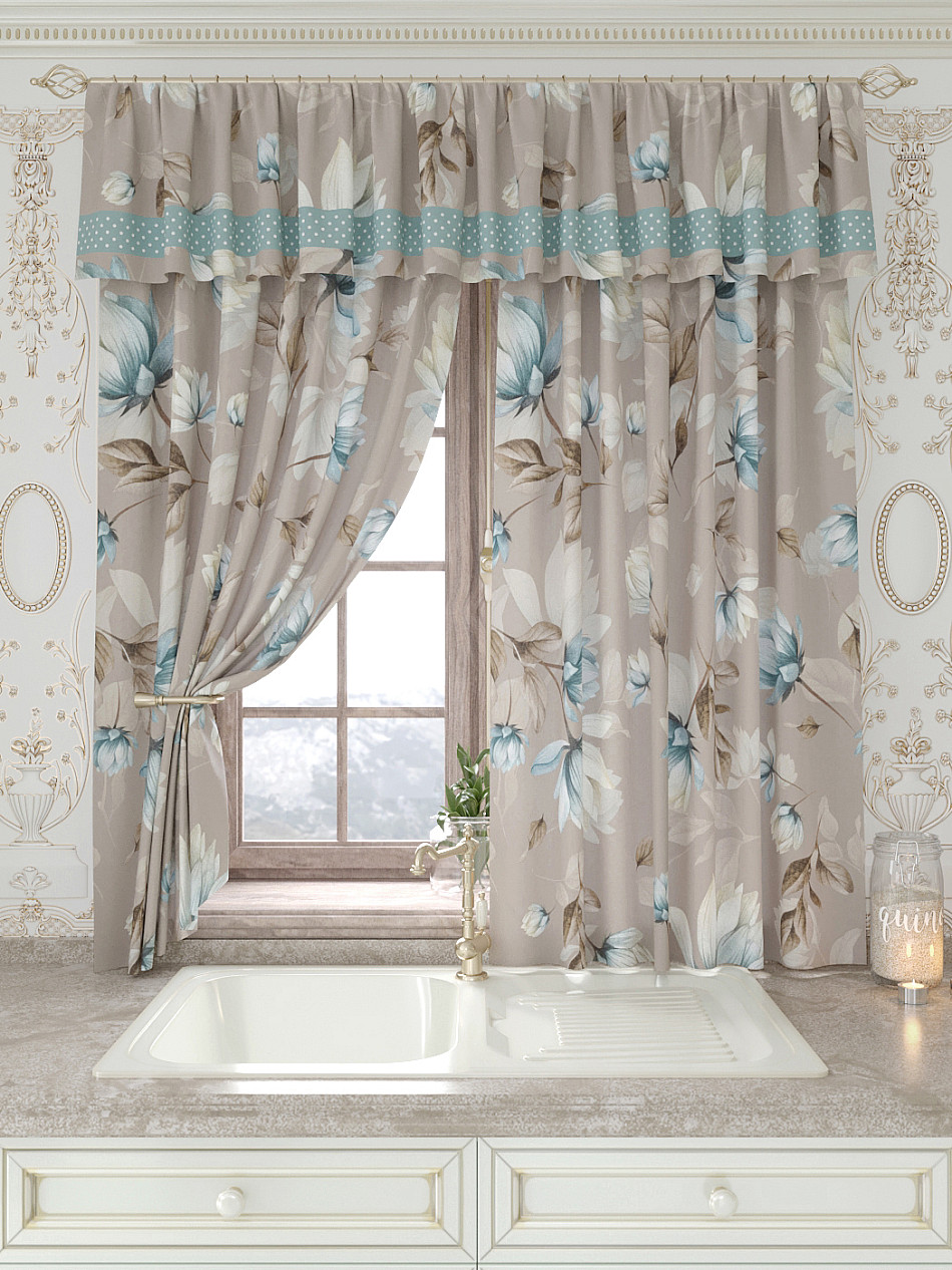 Портьеры 150х160 см. — 2 шт., Ламбрекен 300х40 см. — 1 шт. Комплект штор из легкой портьерной ткани (габардин) оформлен печатным рисунком. Печатный рисунок дает широкие возможности обновить интерьер фактически не требуя ремонта за счет огромного выбора. Ткани с печатным рисунком безопасны и не содержат токсичных веществ. Не смотря на то, что материал легкий, он имеет высокую плотность, мало загрязнятся и не требует особого ухода даже после стирки, что важно для кухонных занавесок. Шторы не выцветают, не растягиваются, превосходно драпируются, образуя струящиеся складки. Прекрасное решение для создания красоты и уюта с помощью уникальных дизайнов.