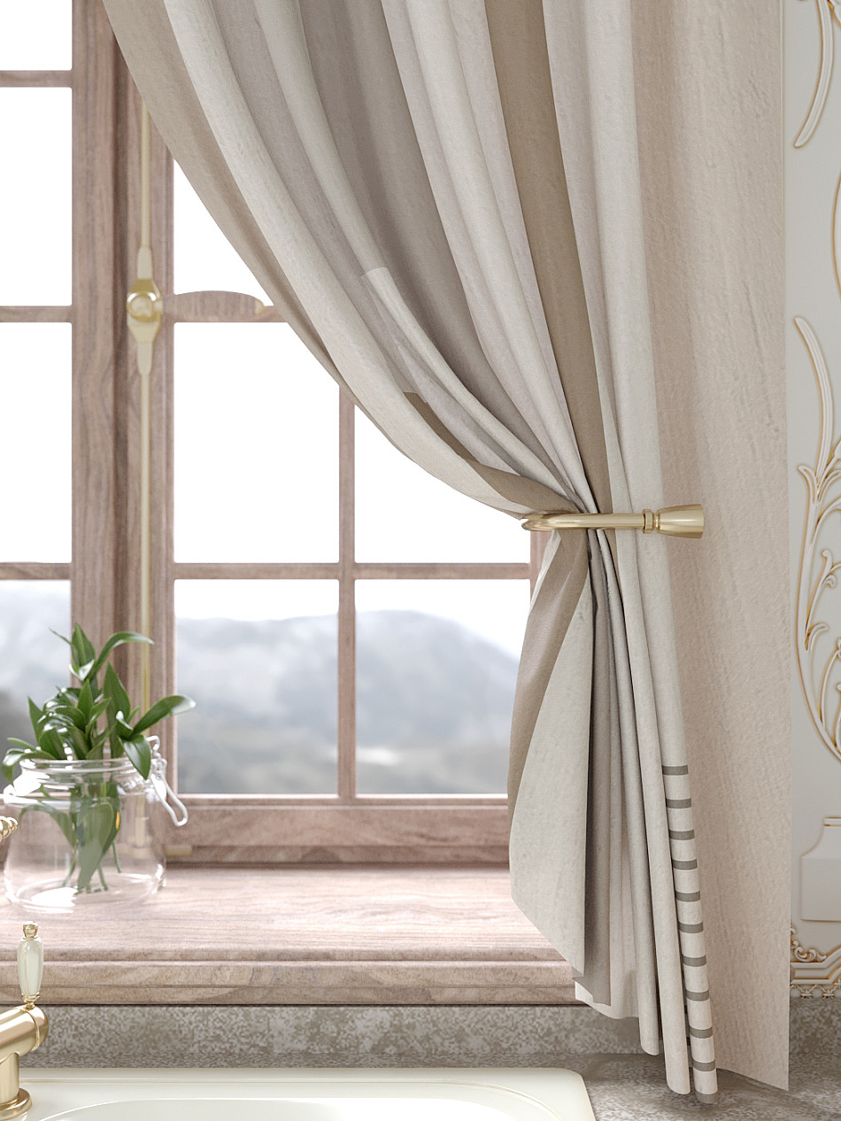 По верхнему краю портьер пришита шторная тесьма 6 см, с ее помощью затянув узелки от кордовых нитей с обеих сторон и стянув их до нужного размера можно сформировать округлые складки, далее вставить крючки в кармашки и повесить на карниз. Обязательно проверьте кордовые нити – они должны быть надежно завязаны, в противном случае во время стягивания они могут вылететь. Шторная тесьма имеет два ряда кармашков, с их помощью можно регулировать не только длину, но и ширину. Такое крепление подходит для всех типов карнизов.