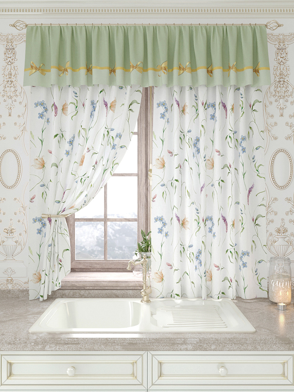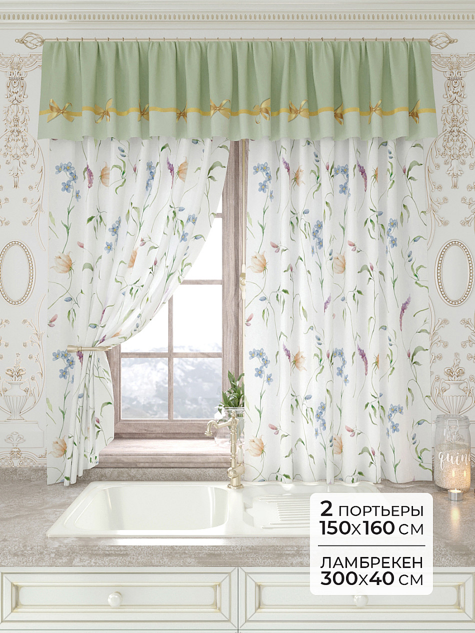 Портьеры 150х160 см. — 2 шт., Ламбрекен 300х40 см. — 1 шт. Комплект штор из легкой портьерной ткани (габардин) оформлен печатным рисунком. Печатный рисунок дает широкие возможности обновить интерьер фактически не требуя ремонта за счет огромного выбора. Ткани с печатным рисунком безопасны и не содержат токсичных веществ. Не смотря на то, что материал легкий, он имеет высокую плотность, мало загрязнятся и не требует особого ухода даже после стирки, что важно для кухонных занавесок. Шторы не выцветают, не растягиваются, превосходно драпируются, образуя струящиеся складки. Прекрасное решение для создания красоты и уюта с помощью уникальных дизайнов.