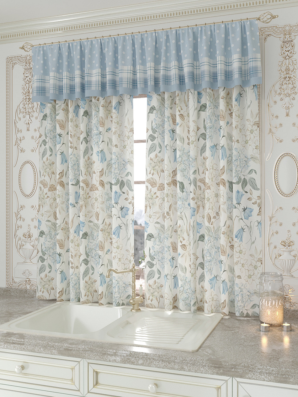 Портьеры 150х160 см. — 2 шт., Ламбрекен 300х40 см. — 1 шт. Комплект штор из легкой портьерной ткани (габардин) оформлен печатным рисунком. Печатный рисунок дает широкие возможности обновить интерьер фактически не требуя ремонта за счет огромного выбора. Ткани с печатным рисунком безопасны и не содержат токсичных веществ. Не смотря на то, что материал легкий, он имеет высокую плотность, мало загрязнятся и не требует особого ухода даже после стирки, что важно для кухонных занавесок. Шторы не выцветают, не растягиваются, превосходно драпируются, образуя струящиеся складки. Прекрасное решение для создания красоты и уюта с помощью уникальных дизайнов.