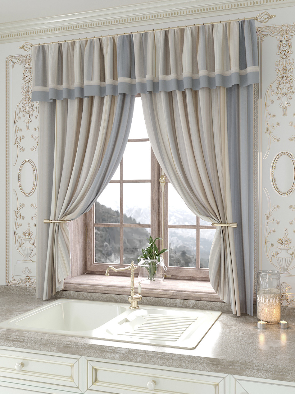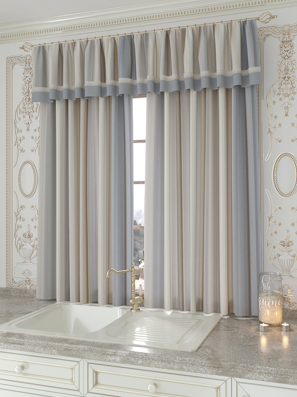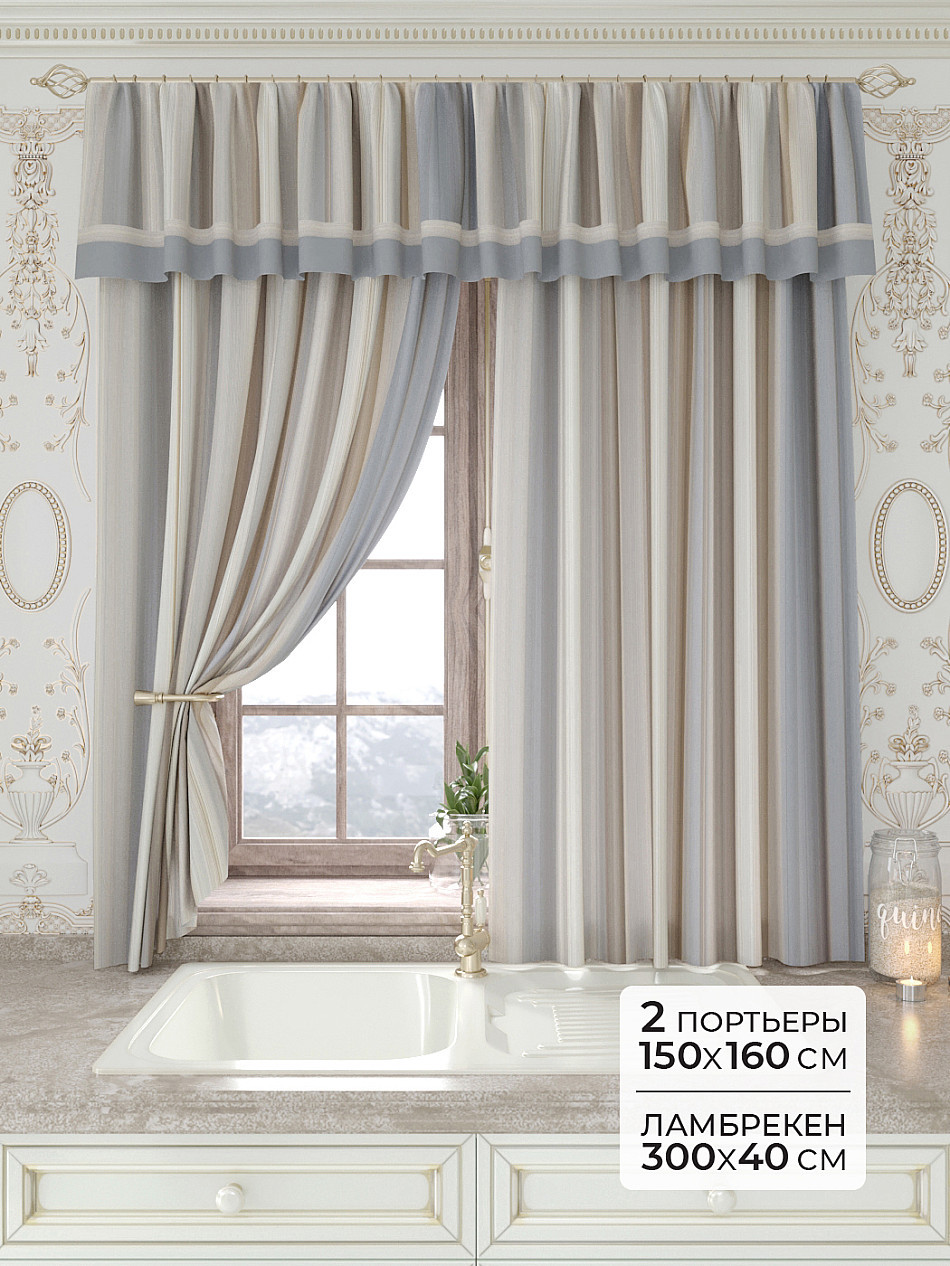 Портьеры 150х160 см. — 2 шт., Ламбрекен 300х40 см. — 1 шт. Комплект штор из легкой портьерной ткани (габардин) оформлен печатным рисунком. Печатный рисунок дает широкие возможности обновить интерьер фактически не требуя ремонта за счет огромного выбора. Ткани с печатным рисунком безопасны и не содержат токсичных веществ. Не смотря на то, что материал легкий, он имеет высокую плотность, мало загрязнятся и не требует особого ухода даже после стирки, что важно для кухонных занавесок. Шторы не выцветают, не растягиваются, превосходно драпируются, образуя струящиеся складки. Прекрасное решение для создания красоты и уюта с помощью уникальных дизайнов.