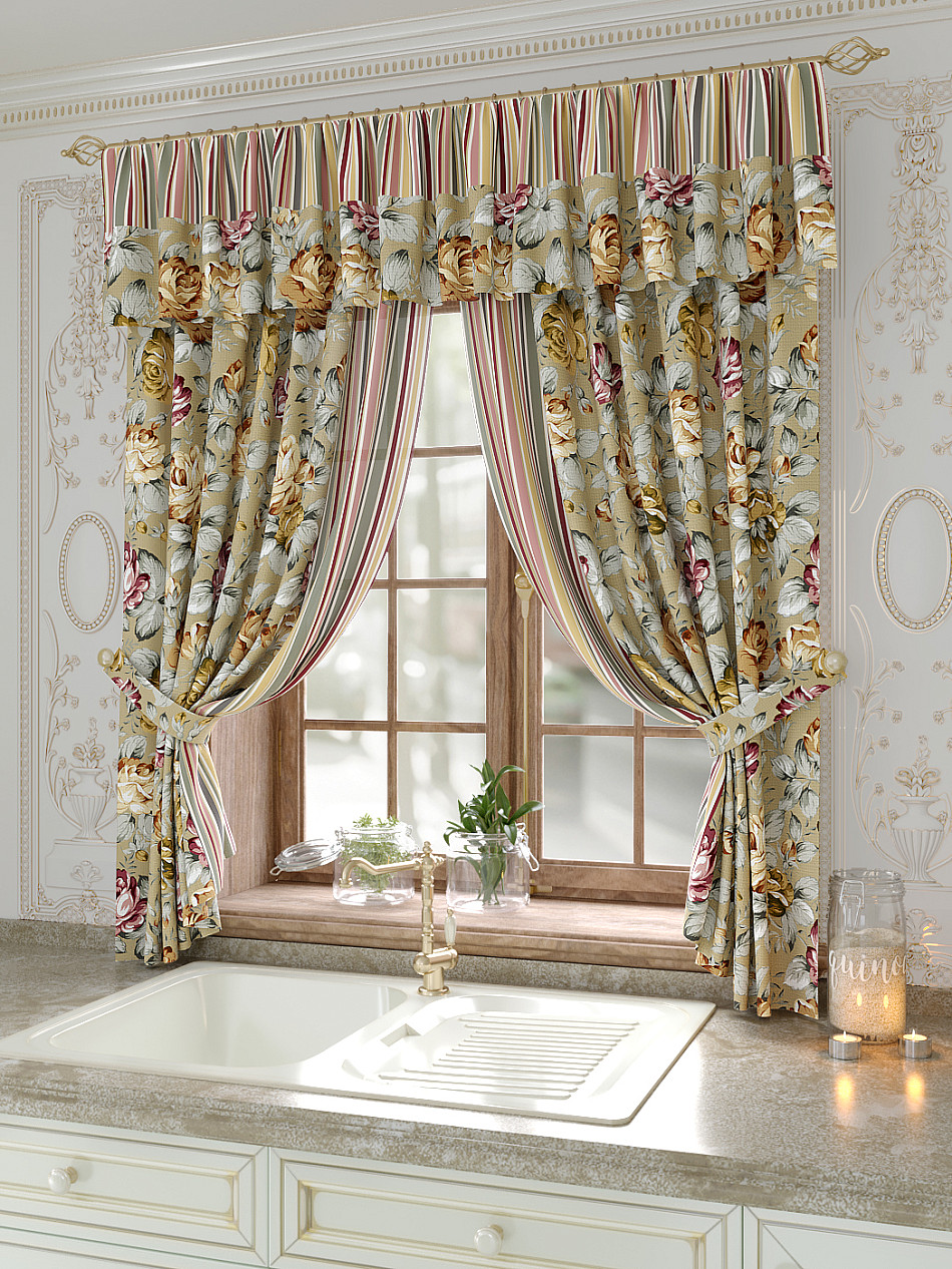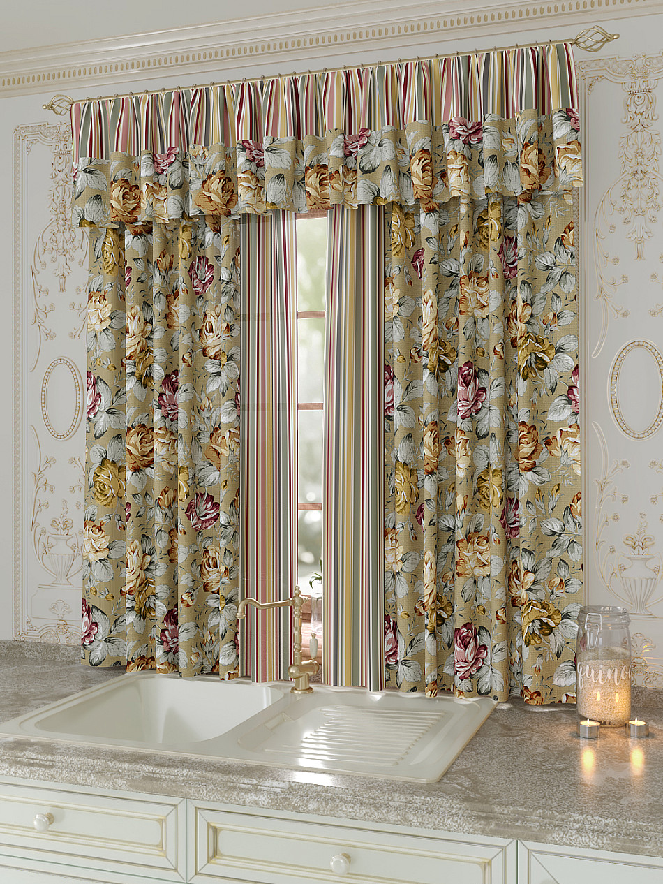 Портьеры 150х160 см. — 2 шт., Ламбрекен 300х40 см. — 1 шт. Комплект штор из легкой портьерной ткани (габардин) оформлен печатным рисунком. Печатный рисунок дает широкие возможности обновить интерьер фактически не требуя ремонта за счет огромного выбора. Ткани с печатным рисунком безопасны и не содержат токсичных веществ. Не смотря на то, что материал легкий, он имеет высокую плотность, мало загрязнятся и не требует особого ухода даже после стирки, что важно для кухонных занавесок. Шторы не выцветают, не растягиваются, превосходно драпируются, образуя струящиеся складки. Прекрасное решение для создания красоты и уюта с помощью уникальных дизайнов.