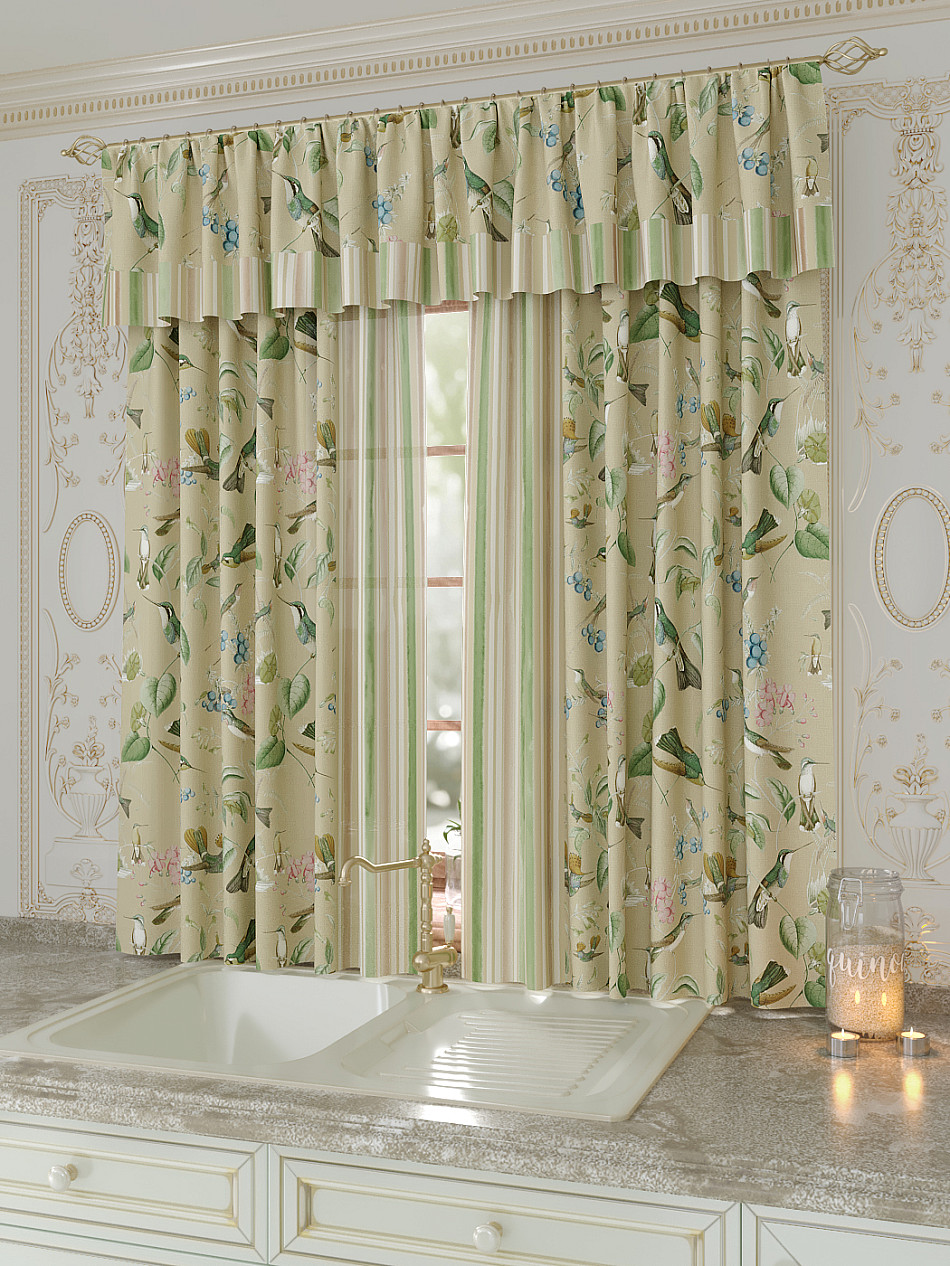 Портьеры 150х160 см. — 2 шт., Ламбрекен 300х40 см. — 1 шт.Комплект штор из легкой портьерной ткани (габардин) оформлен печатным рисунком. Печатный рисунок дает широкие возможности обновить интерьер фактически не требуя ремонта за счет огромного выбора. Ткани с печатным рисунком безопасны и не содержат токсичных веществ. Не смотря на то, что материал легкий, он имеет высокую плотность, мало загрязнятся и не требует особого ухода даже после стирки, что важно для кухонных занавесок. Шторы не выцветают, не растягиваются, превосходно драпируются, образуя струящиеся складки. Прекрасное решение для создания красоты и уюта с помощью уникальных дизайнов.