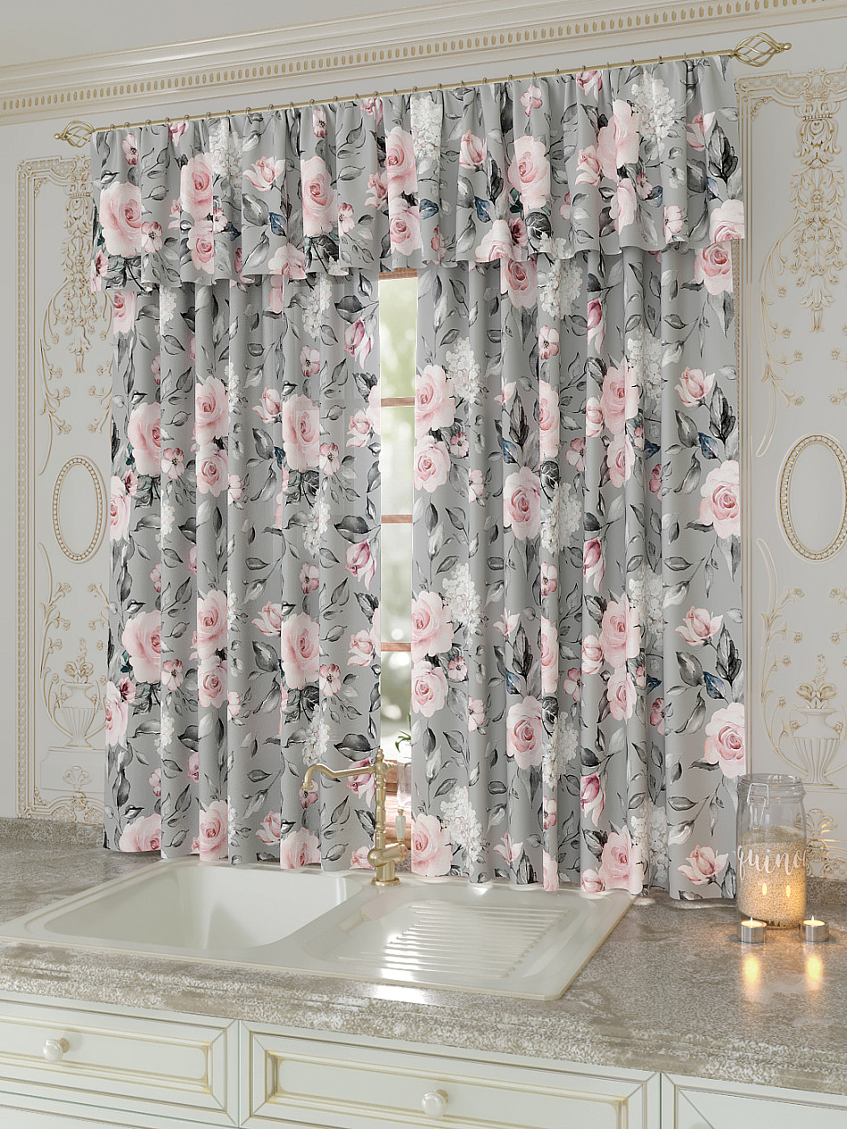 Портьеры 150х160 см. — 2 шт., Ламбрекен 300х40 см. — 1 шт. Комплект штор из легкой портьерной ткани (габардин) оформлен печатным рисунком. Печатный рисунок дает широкие возможности обновить интерьер фактически не требуя ремонта за счет огромного выбора. Ткани с печатным рисунком безопасны и не содержат токсичных веществ. Не смотря на то, что материал легкий, он имеет высокую плотность, мало загрязнятся и не требует особого ухода даже после стирки, что важно для кухонных занавесок. Шторы не выцветают, не растягиваются, превосходно драпируются, образуя струящиеся складки. Прекрасное решение для создания красоты и уюта с помощью уникальных дизайнов.