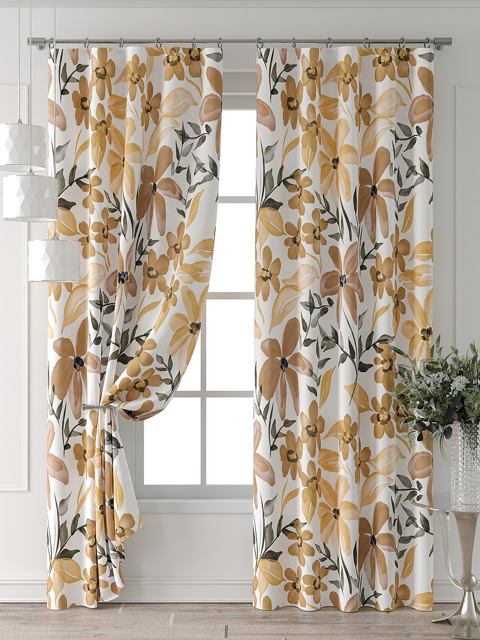 Портьера 2 шт. Подхват - доп.услуга. Комплект штор из легкой портьерной ткани (габардин) оформлен печатным рисунком. Печатный рисунок дает широкие возможности обновить интерьер фактически нет требуя ремонта за счет огромного выбора. Ткани с печатным рисунком безопасны и не содержат токсичных веществ. Не смотря на то что, материал легкий, он имеет высокую плотность, мало загрязнятся и не требует особого ухода даже после стирки, что важно для кухонных занавесок. Шторы не выцветают, не растягиваются, превосходно драпируются, образуя струящиеся складки. Прекрасное решение для создания красоты и уюта с помощью уникальных дизайнов.