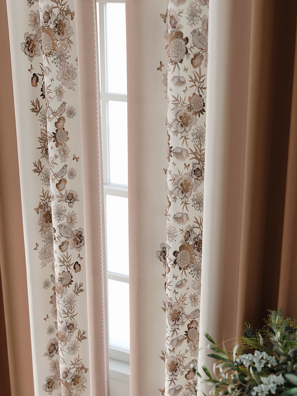 По верхнему краю портьер пришита шторная тесьма 6 см, с ее помощью затянув узелки от кордовых нитей с обеих сторон и стянув их до нужного размера можно сформировать округлые складки, далее вставить крючки в кармашки и повесить на карниз. Обязательно проверьте кордовые нити – они должны быть надежно завязаны, в противном случае во время стягивания они могут вылететь. Шторная тесьма имеет два ряда кармашков, с их помощью можно регулировать не только длину, но и ширину. Такое крепление подходит для всех типов карнизов.