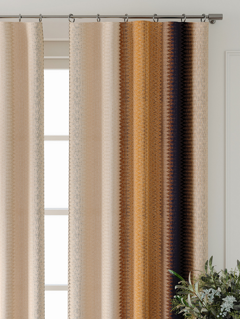 По верхнему краю портьер пришита шторная тесьма 6 см, с ее помощью затянув узелки от кордовых нитей с обеих сторон и стянув их до нужного размера можно сформировать округлые складки, далее вставить крючки в кармашки и повесить на карниз. Обязательно проверьте кордовые нити – они должны быть надежно завязаны, в противном случае во время стягивания они могут вылететь. Шторная тесьма имеет два ряда кармашков, с их помощью можно регулировать не только длину, но и ширину. Такое крепление подходит для всех типов карнизов.