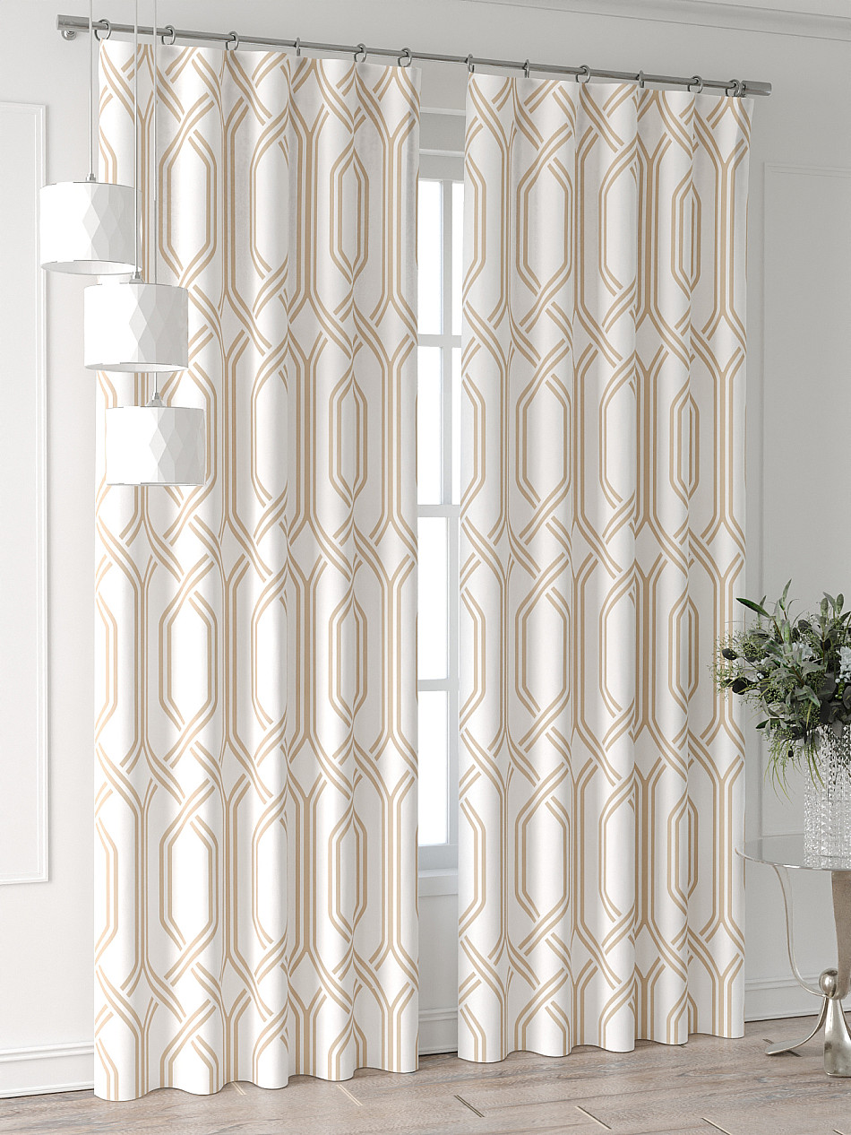 По верхнему краю портьер пришита шторная тесьма 6 см, с ее помощью затянув узелки от кордовых нитей с обеих сторон и стянув их до нужного размера можно сформировать округлые складки, далее вставить крючки в кармашки и повесить на карниз. Обязательно проверьте кордовые нити – они должны быть надежно завязаны, в противном случае во время стягивания они могут вылететь. Шторная тесьма имеет два ряда кармашков, с их помощью можно регулировать не только длину, но и ширину. Такое крепление подходит для всех типов карнизов.