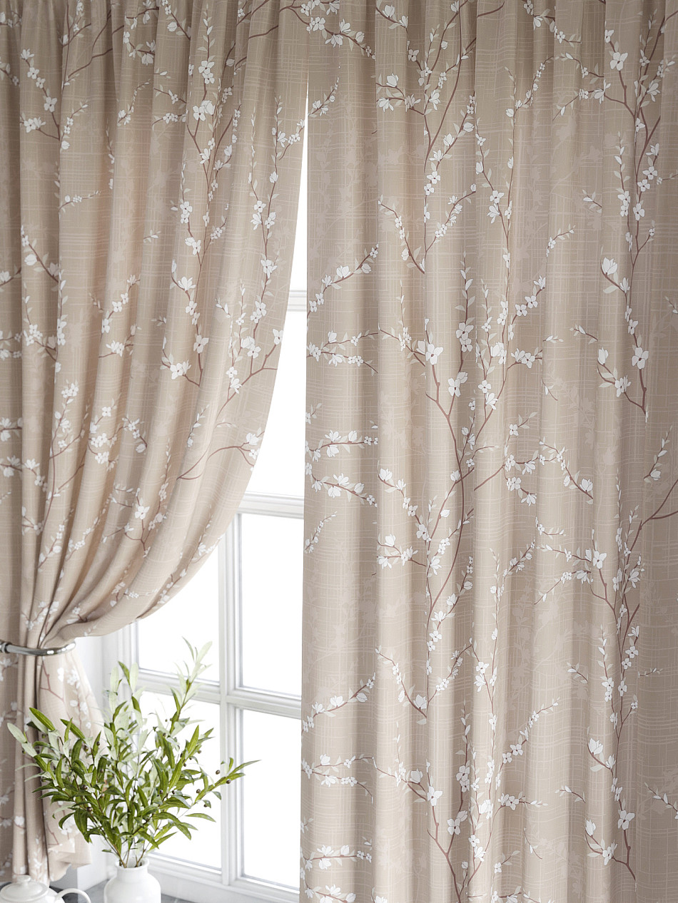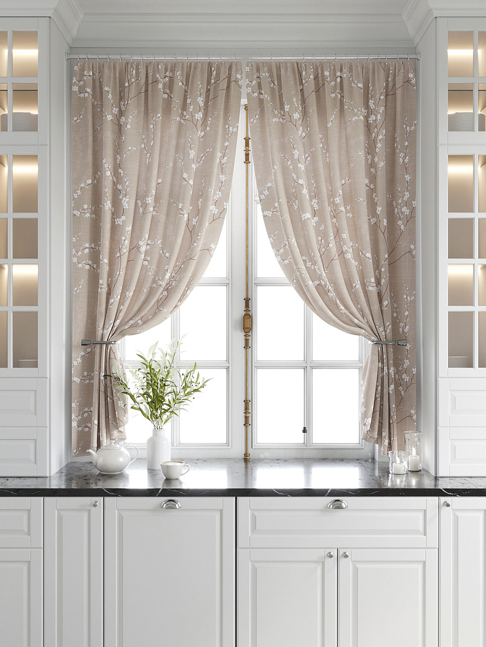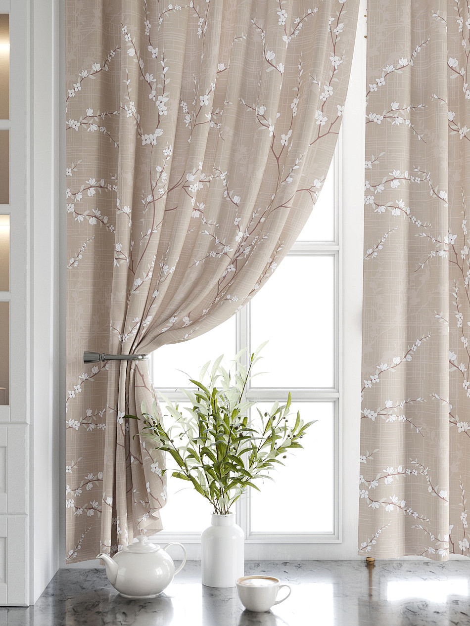 Комплект штор из легкой портьерной ткани (габардин) оформлен печатным рисунком. Печатный рисунок дает широкие возможности обновить интерьер фактически нет требуя ремонта за счет огромного выбора. Ткани с печатным рисунком безопасны и не содержат токсичных веществ. Не смотря на то что, материал легкий, он имеет высокую плотность, мало загрязнятся и не требует особого ухода даже после стирки, что важно для кухонных занавесок. Шторы не выцветают, не растягиваются, превосходно драпируются, образуя струящиеся складки. Прекрасное решение для создания красоты и уюта с помощью уникальных дизайнов.